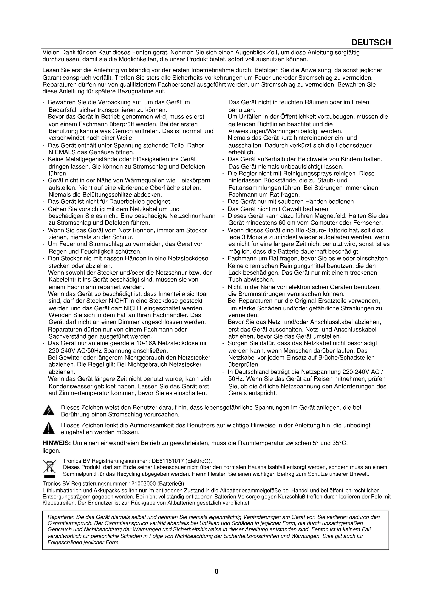 - Duw de stylus naar boven in de richting "C" totdat de stylus in de tippositie vastklikt.8 DEUTSCH Vielen Dank für den Kauf dieses Fenton gerat. Nehmen Sie sich einen Augenblick Zeit, um diese Anleitung sorgfältig durchzulesen, damit sie die Möglichkeiten, die unser Produkt bietet, sofort voll ausnutzen können. Lesen Sie erst die Anleitung vollständig vor der ersten Inbetriebnahme durch. Befolgen Sie die Anweisung, da sonst jeglicher Garantieanspruch verfällt. Treffen Sie stets alle Sicherheits-vorkehrungen um Feuer und/oder Stromschlag zu vermeiden. Reparaturen dürfen nur von qualifiziertem Fachpersonal ausgeführt werden, um Stromschlag zu vermeiden. Bewahren Sie diese Anleitung für spätere Bezugnahme auf. - Bewahren Sie die Verpackung auf, um das Gerät im Bedarfsfall sicher transportieren zu können. - Bevor das Gerät in Betrieb genommen wird, muss es erst von einem Fachmann überprüft werden. Bei der ersten Benutzung kann etwas Geruch auftreten. Das ist normal und verschwindet nach einer Weile - Das Gerät enthält unter Spannung stehende Teile. Daher NIEMALS das Gehäuse öffnen. - Keine Metallgegenstände oder Flüssigkeiten ins Gerät dringen lassen. Sie können zu Stromschlag und Defekten führen. - Gerät nicht in der Nähe von Wärmequellen wie Heizkörpern aufstellen. Nicht auf eine vibrierende Oberfläche stellen. Niemals die Belüftungsschlitze abdecken. - Das Gerät ist nicht für Dauerbetrieb geeignet. - Gehen Sie vorsichtig mit dem Netzkabel um und beschädigen Sie es nicht. Eine beschädigte Netzschnur kann zu Stromschlag und Defekten führen. - Wenn Sie das Gerät vom Netz trennen, immer am Stecker ziehen, niemals an der Schnur. - Um Feuer und Stromschlag zu vermeiden, das Gerät vor Regen und Feuchtigkeit schützen. - Den Stecker nie mit nassen Händen in eine Netzsteckdose stecken oder abziehen. - Wenn sowohl der Stecker und/oder die Netzschnur bzw. der Kabeleintritt ins Gerät beschädigt sind, müssen sie von einem Fachmann repariert werden. - Wenn das Gerät so beschädigt ist, dass Innenteile sichtbar sind, darf der Stecker NICHT in eine Steckdose gesteckt werden und das Gerät darf NICHT eingeschaltet werden. Wenden Sie sich in dem Fall an Ihren Fachhändler. Das Gerät darf nicht an einen Dimmer angeschlossen werden. - Reparaturen dürfen nur von einem Fachmann oder Sachverständigen ausgeführt werden. - Das Gerät nur an eine geerdete 10-16A Netzsteckdose mit 220-240V AC/50Hz Spannung anschließen. - Bei Gewitter oder längerem Nichtgebrauch den Netzstecker abziehen. Die Regel gilt: Bei Nichtgebrauch Netzstecker abziehen. - Wenn das Gerät längere Zeit nicht benutzt wurde, kann sich Kondenswasser gebildet haben. Lassen Sie das Gerät erst auf Zimmertemperatur kommen, bevor Sie es einschalten. Das Gerät nicht in feuchten Räumen oder im Freien benutzen. - Um Unfällen in der Öffentlichkeit vorzubeugen, müssen die geltenden Richtlinien beachtet und die Anweisungen/Warnungen befolgt werden. - Niemals das Gerät kurz hintereinander ein- und ausschalten. Dadurch verkürzt sich die Lebensdauer erheblich. - Das Gerät außerhalb der Reichweite von Kindern halten. Das Gerät niemals unbeaufsichtigt lassen. - Die Regler nicht mit Reinigungssprays reinigen. Diese hinterlassen Rückstände, die zu Staub- und Fettansammlungen führen. Bei Störungen immer einen Fachmann um Rat fragen. - Das Gerät nur mit sauberen Händen bedienen. - Das Gerät nicht mit Gewalt bedienen. - Dieses Gerät kann dazu führen Magnetfeld. Halten Sie das Gerät mindestens 60 cm vom Computer oder Fernseher. - Wenn dieses Gerät eine Blei-Säure-Batterie hat, soll dies jede 3 Monate zumindest wieder aufgeladen werden, wenn es nicht für eine längere Zeit nicht benutzt wird, sonst ist es möglich, dass die Batterie dauerhaft beschädigt. - Fachmann um Rat fragen, bevor Sie es wieder einschalten. - Keine chemischen Reinigungsmittel benutzen, die den Lack beschädigen. Das Gerät nur mit einem trockenen Tuch abwischen. - Nicht in der Nähe von elektronischen Geräten benutzen, die Brummstörungen verursachen können. - Bei Reparaturen nur die Original-Ersatzteile verwenden, um starke Schäden und/oder gefährliche Strahlungen zu vermeiden. - Bevor Sie das Netz- und/oder Anschlusskabel abziehen, erst das Gerät ausschalten. Netz- und Anschlusskabel abziehen, bevor Sie das Gerät umstellen. - Sorgen Sie dafür, dass das Netzkabel nicht beschädigt werden kann, wenn Menschen darüber laufen. Das Netzkabel vor jedem Einsatz auf Brüche/Schadstellen überprüfen. - In Deutschland beträgt die Netzspannung 220-240V AC / 50Hz. Wenn Sie das Gerät auf Reisen mitnehmen, prüfen Sie, ob die örtliche Netzspannung den Anforderungen des Geräts entspricht. Dieses Zeichen weist den Benutzer darauf hin, dass lebensgefährliche Spannungen im Gerät anliegen, die bei Berührung einen Stromschlag verursachen. Dieses Zeichen lenkt die Aufmerksamkeit des Benutzers auf wichtige Hinweise in der Anleitung hin, die unbedingt eingehalten werden müssen. HINWEIS: Um einen einwandfreien Betrieb zu gewährleisten, muss die Raumtemperatur zwischen 5° und 35°C. liegen. Tronios BV Registrierungsnummer : DE51181017 (ElektroG). Dieses Produkt darf am Ende seiner Lebensdauer nicht über den normalen Haushaltsabfall entsorgt werden, sondern muss an einem Sammelpunkt für das Recycling abgegeben werden. Hiermit leisten Sie einen wichtigen Beitrag zum Schutze unserer Umwelt. Tronios BV Registrierungsnummer : 21003000 (BatterieG). Lithiumbatterien und Akkupacks sollten nur im entladenen Zustand in die Altbatteriesammelgefäße bei Handel und bei öffentlich-rechtlichen Entsorgungsträgern gegeben werden. Bei nicht vollständig entladenen Batterien Vorsorge gegen Kurzschlüß treffen durch Isolieren der Pole mit Klebestreifen. Der Endnutzer ist zur Rückgabe von Altbatterien gesetzlich verpflichtet.