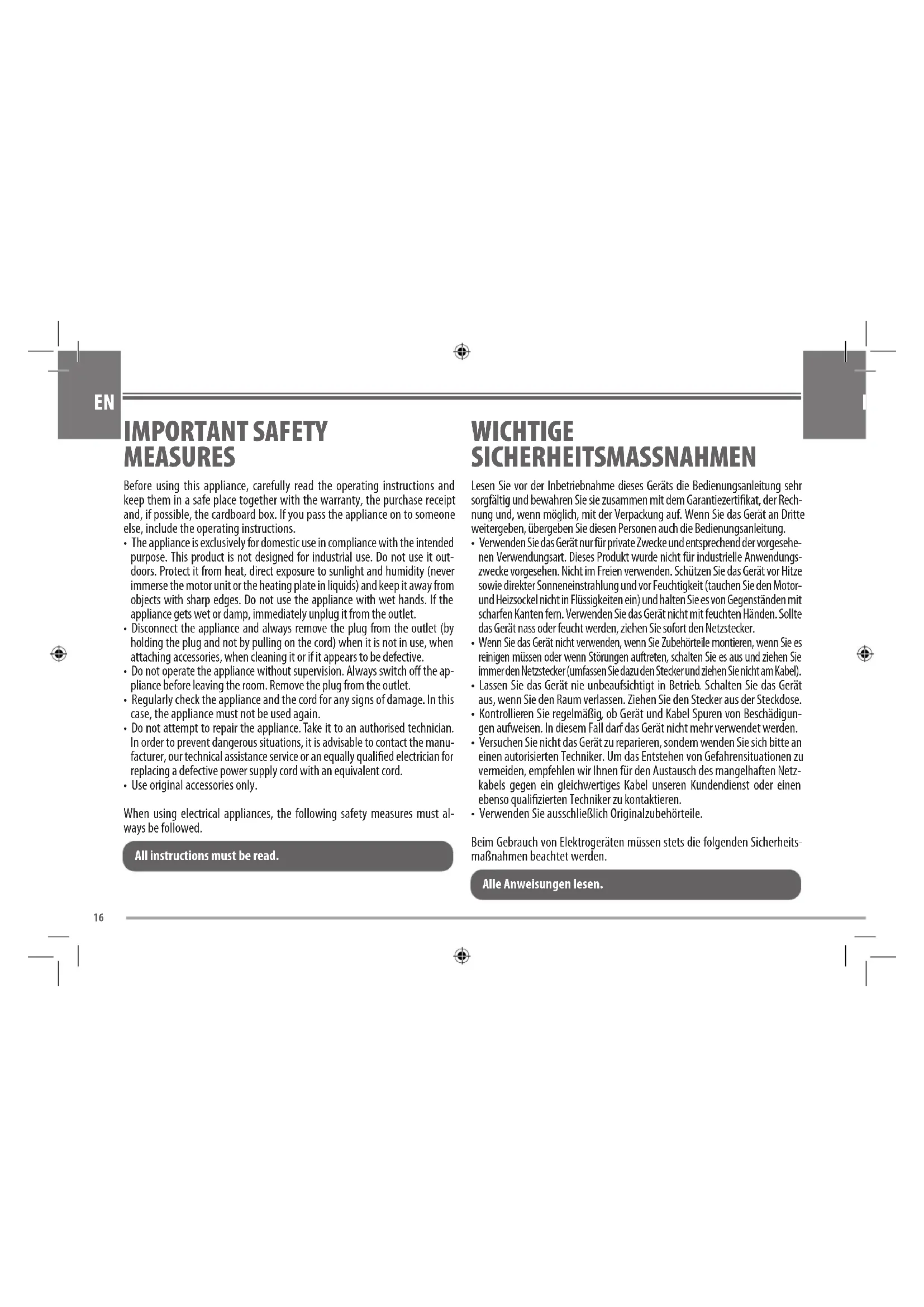 - Use original accessories only. When using electrical appliances, the following safety measures must al- ways be followed. All instructions must be read. WICHTIGE SICHERHEITSMASSNAHMEN Lesen Sie vor der Inbetriebnahme dieses Geräts die Bedienungsanleitung sehr sorgfältig und bewahren Sie sie zusammen mit dem Garantiezertikat, der Rech- nung und, wenn möglich, mit der Verpackung auf. Wenn Sie das Gerät an Dritte weitergeben, übergeben Sie diesen Personen auch die Bedienungsanleitung.