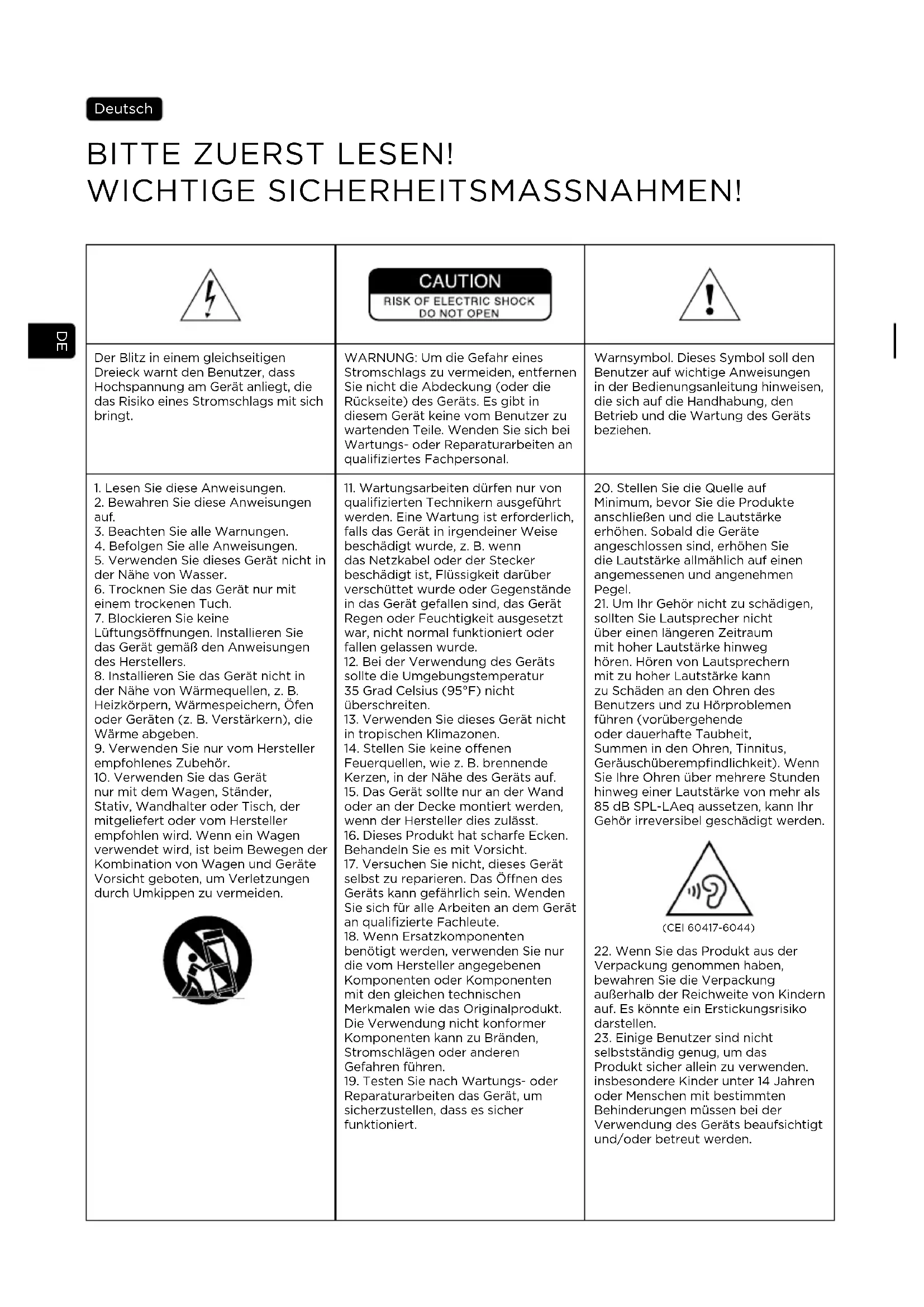Gebrauchsanleitung Einspielzeit Die in den Theva-Modellen verwendeten Lautsprecherchassis sind komplexe mechanische Bauteile, die eine gewisse Zeit benötigen, um sich an die Temperatur- und Feuchtigkeitsbedingungen Ihres Hörraums anzupassen und optimale Performance zu bieten. Die Einspielzeit hängt von verschiedenen Faktoren ab und kann mehrere Wochen betragen. Um den Vorgang zu beschleunigen, empfehlen wir, etwa zwanzig Stunden am Stück Musik über die Lautsprecher laufen zu lassen. Nachdem sich die mechanischen Eigenschaften der Chassis vollständig stabilisiert haben, können Sie das gesamte klangliche Potenzial Ihrer Theva-Lautsprecher genießen. Besondere Vorsichtsmaßnahmen Die Pflege der Theva-Lautsprecher beschränkt sich auf gelegentliches Abstauben mit einem trockenen Tuch. Flecken am Lautsprechergehäuse sollten mit einem feuchten Tuch entfernt werden. Verwenden Sie niemals Lösungs- bzw. Reinigungsmittel, Alkohole, Ätzmittel, Schaber oder Schleifmittel, um die Oberfläche des Gehäuses zu reinigen. Halten Sie die Lautsprecher von Hitzequellen fern. Wahl des Verstärkers Ihre Lautsprecher können eher durch zu schwache als durch zu leistungsstarke Verstärker beschädigt werden. Wenn eine zu hohe Lautstärke gewählt wird, erreicht der Verstärker den Sättigungsbereich und erzeugt Störsignale, die den Hochtöner beschädigen können. Die dynamische Kapazität und das Auflösungsvermögen der Theva-Lautsprecher sind groß genug, um die Qualitäten oder Fehler jedes angeschlossenen Verstärkers aufzuzeigen. Ihr Händler wird Ihnen bei der Wahl eines passenden Verstärkers behilflich sein. Garantiebedingungen Alle Focal-Produkte werden von einer Garantie abgedeckt, die von der offiziellen Focal-Vertriebsgesellschaft Ihres Landes ausgearbeitet wurde. Diese kann Ihnen weiterführende Informationen zu den Garantiebedingungen zur Verfügung stellen. Die Garantie umfasst mindestens die Bedingungen, die vom Gesetzgeber des Landes, in dem der Original- Kaufbeleg ausgestellt wurde, eingeräumt werden.IT LEGGERE PRIMA DELL’USO ! IMPORTANI PRECAUZIONI DI SICUREZZA ! Italiano Il fulmine all’interno di un triangolo equilatero avverte l’utente della presenza di alta tensione all’interno del dispositivo che può costituire un rischio di scossa elettrica. ATTENZIONE: per evitare il rischio di scosse elettriche, non rimuovere la copertura (o la parte posteriore) del dispositivo. Nel dispositivo non sono presenti parti aggiustabili dall’utente. Per la manutenzione o eventuali riparazioni, rivolgersi a un professionista qualificato. Simbolo di avvertenza. Questo simbolo avverte l’utente della presenza di importanti istruzioni contenute nel manuale d’uso e relative al maneggio, al funzionamento e alla manutenzione del dispositivo.