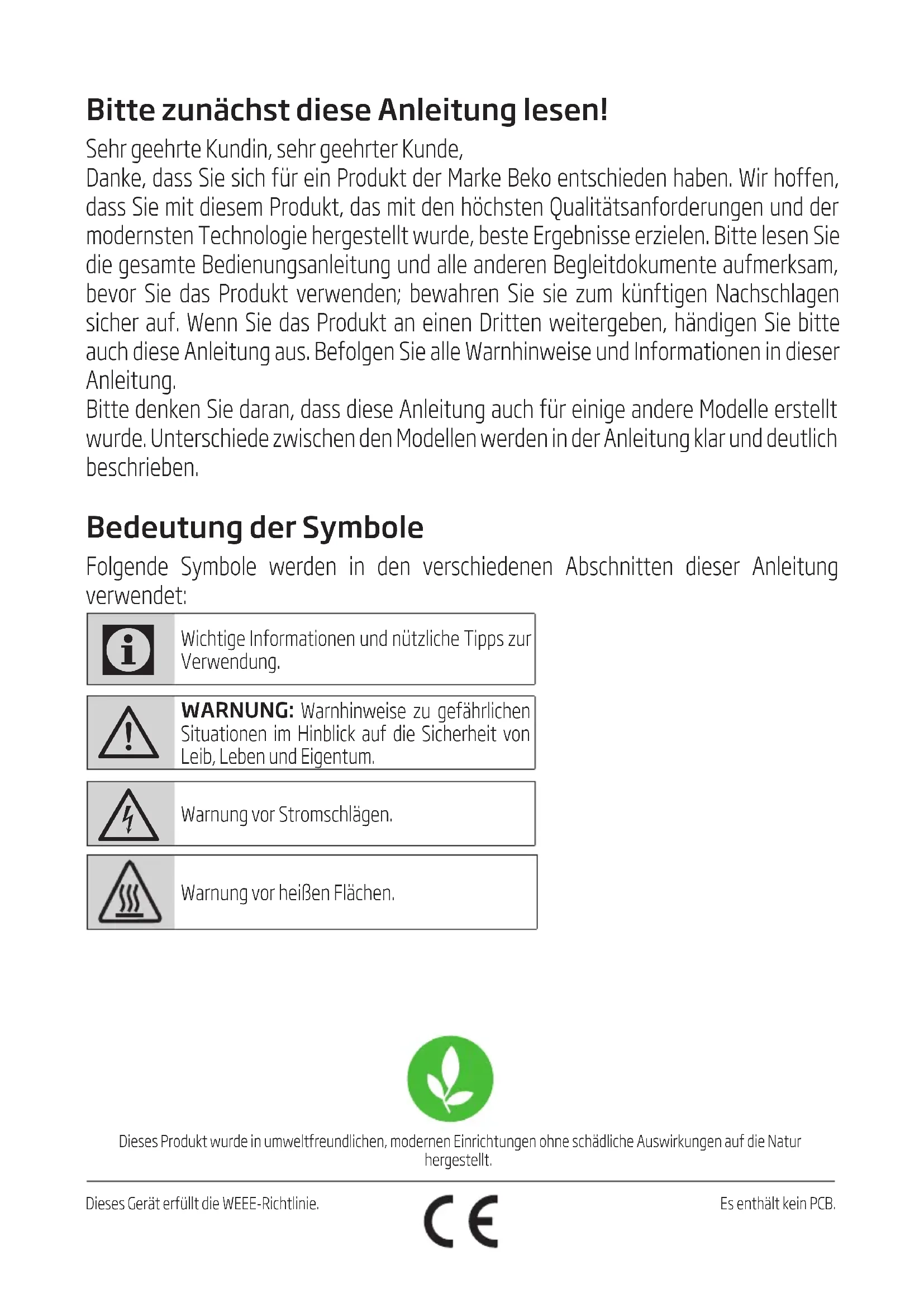 Иключете абсорбатора от електриче-ската мрежа. ПРЕДУПРЕЖДЕНИЕ: Преди да докоснете круш-ките, се уверете, че са из-стинали.Сменете повредената лампа.Използвайте само LED лампи с макс. E14 3W. За повече подробности про-верете приложената листовка „ILCOS D“ (буквено-цифрова позиция „1d“).Ако трябва да транспортирате уре- -Запазете оригиналната му опаковка. Транспортирайте уреда в оригинал-ната опаковка и следвайте транс-портните й маркировки.Ако не разполагате с оригинална опаковка:-Не поставяйте никакви предмети върху стъклената повърхност.-Защитете външната повърхност от удари.-Опаковайте уреда така, че да не бъде повреден при транспортиране- то.Dieses Produkt wurde in umweltfreundlichen, modernen Einrichtungen ohne schädliche Auswirkungen auf die Natur hergestellt.Dieses Gerät erfüllt die WEEE-Richtlinie.Es enthält kein PCB. Bitte zunächst diese Anleitung lesen! Sehr geehrte Kundin, sehr geehrter Kunde, Danke, dass Sie sich für ein Produkt der Marke Beko entschieden haben. Wir hoffen, dass Sie mit diesem Produkt, das mit den höchsten Qualitätsanforderungen und der modernsten Technologie hergestellt wurde, beste Ergebnisse erzielen. Bitte lesen Sie die gesamte Bedienungsanleitung und alle anderen Begleitdokumente aufmerksam, bevor Sie das Produkt verwenden; bewahren Sie sie zum künftigen Nachschlagen sicher auf. Wenn Sie das Produkt an einen Dritten weitergeben, händigen Sie bitte auch diese Anleitung aus. Befolgen Sie alle Warnhinweise und Informationen in dieser Anleitung. Bitte denken Sie daran, dass diese Anleitung auch für einige andere Modelle erstellt wurde. Unterschiede zwischen den Modellen werden in der Anleitung klar und deutlich beschrieben. Bedeutung der Symbole Folgende Symbole werden in den verschiedenen Abschnitten dieser Anleitung verwendet:
