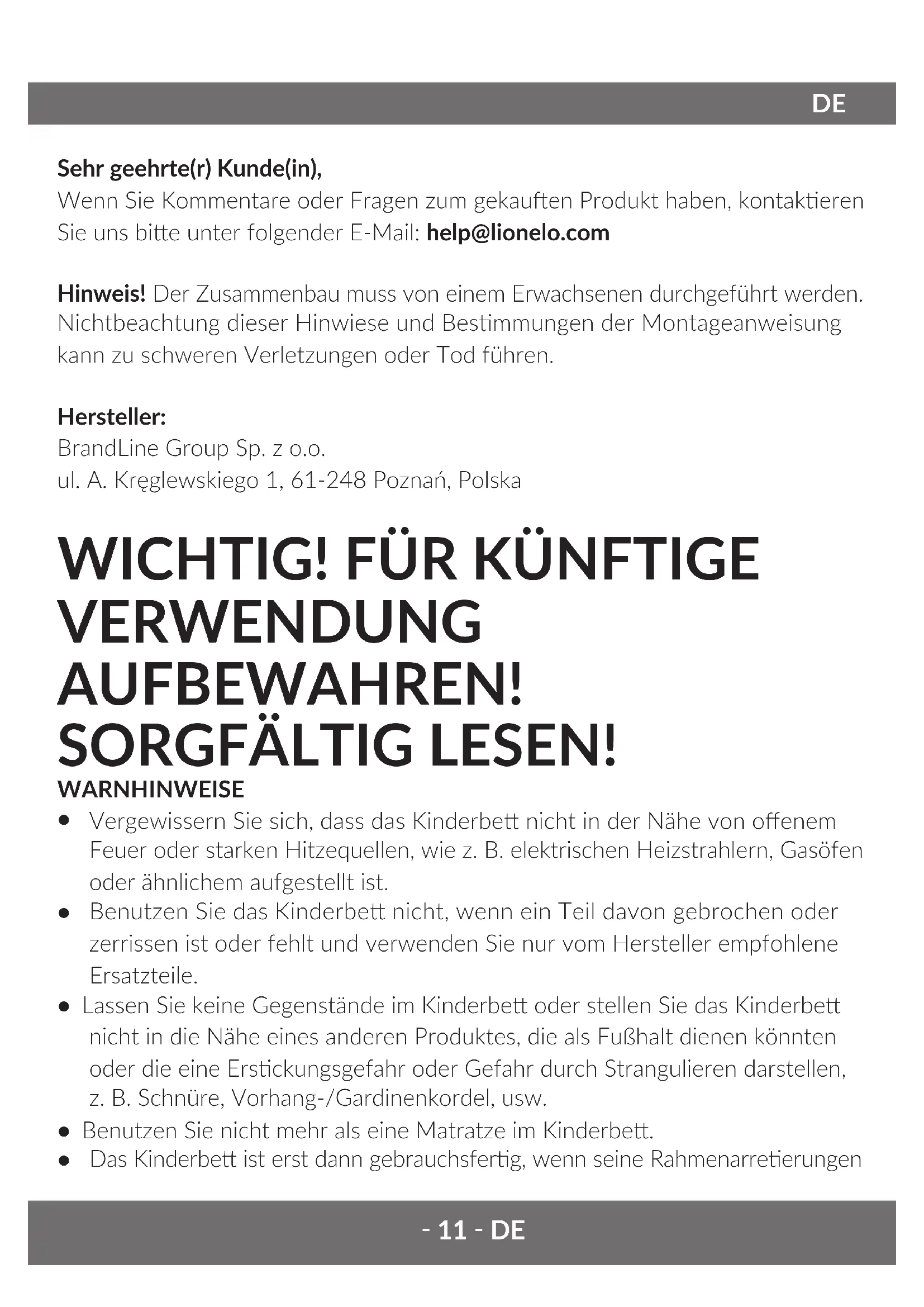 Sehr geehrte(r) Kunde(in), Wenn Sie Kommentare oder Fragen zum gekauen Produkt haben, kontakeren Sie uns bie unter folgender E-Mail: help@lionelo.com Hinweis! Der Zusammenbau muss von einem Erwachsenen durchgeführt werden. Nichtbeachtung dieser Hinwiese und Besmmungen der Montageanweisung kann zu schweren Verletzungen oder Tod führen. Hersteller: BrandLine Group Sp. z o.o. ul. A. Kręglewskiego 1, 61-248 Poznań, Polska