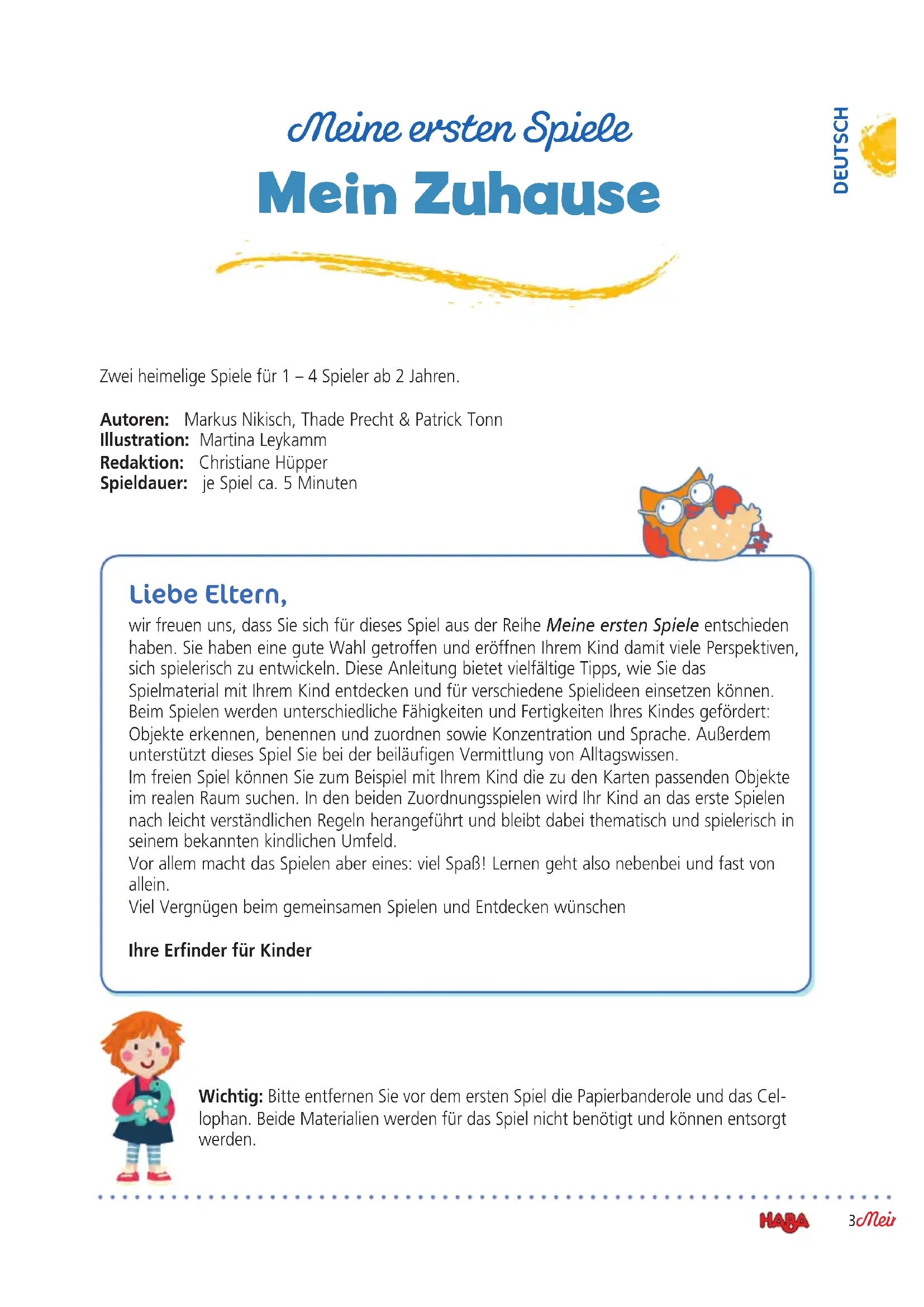 Copyright - Spiele Bad Rodach 2021 Mein Zuhause · My Home · Bienvenue à la maison Mijn thuis · Mi Casa· La mia casa Spielanleitung Rulebook Règle du jeu Spelregels Instrucciones Istruzioni Meine ersten Spiele Mein Zuhause 306354_Anl_MES_Mein_Zuhause_DE_B21963.indd 1 29.07.21 14:54306354_Anl_MES_Mein_Zuhause_DE_B21963.indd 2 29.07.21 14:543Meine ersten Spiele DEUTSCH Meine ersten Spiele Mein Zuhause Zwei heimelige Spiele für 1 – 4 Spieler ab 2 Jahren. Autoren: Markus Nikisch, Thade Precht & Patrick Tonn Illustration: Martina Leykamm Redaktion: Christiane Hüpper Spieldauer: je Spiel ca. 5 Minuten Liebe Eltern, wir freuen uns, dass Sie sich für dieses Spiel aus der Reihe Meine ersten Spiele entschieden haben. Sie haben eine gute Wahl getroffen und eröffnen Ihrem Kind damit viele Perspektiven, sich spielerisch zu entwickeln. Diese Anleitung bietet vielfältige Tipps, wie Sie das Spielmaterial mit Ihrem Kind entdecken und für verschiedene Spielideen einsetzen können. Beim Spielen werden unterschiedliche Fähigkeiten und Fertigkeiten Ihres Kindes gefördert: Objekte erkennen, benennen und zuordnen sowie Konzentration und Sprache. Außerdem unterstützt dieses Spiel Sie bei der beiläufigen Vermittlung von Alltagswissen. Im freien Spiel können Sie zum Beispiel mit Ihrem Kind die zu den Karten passenden Objekte im realen Raum suchen. In den beiden Zuordnungsspielen wird Ihr Kind an das erste Spielen nach leicht verständlichen Regeln herangeführt und bleibt dabei thematisch und spielerisch in seinem bekannten kindlichen Umfeld. Vor allem macht das Spielen aber eines: viel Spaß! Lernen geht also nebenbei und fast von allein. Viel Vergnügen beim gemeinsamen Spielen und Entdecken wünschen Ihre Erfinder für Kinder Wichtig: Bitte entfernen Sie vor dem ersten Spiel die Papierbanderole und das Cel