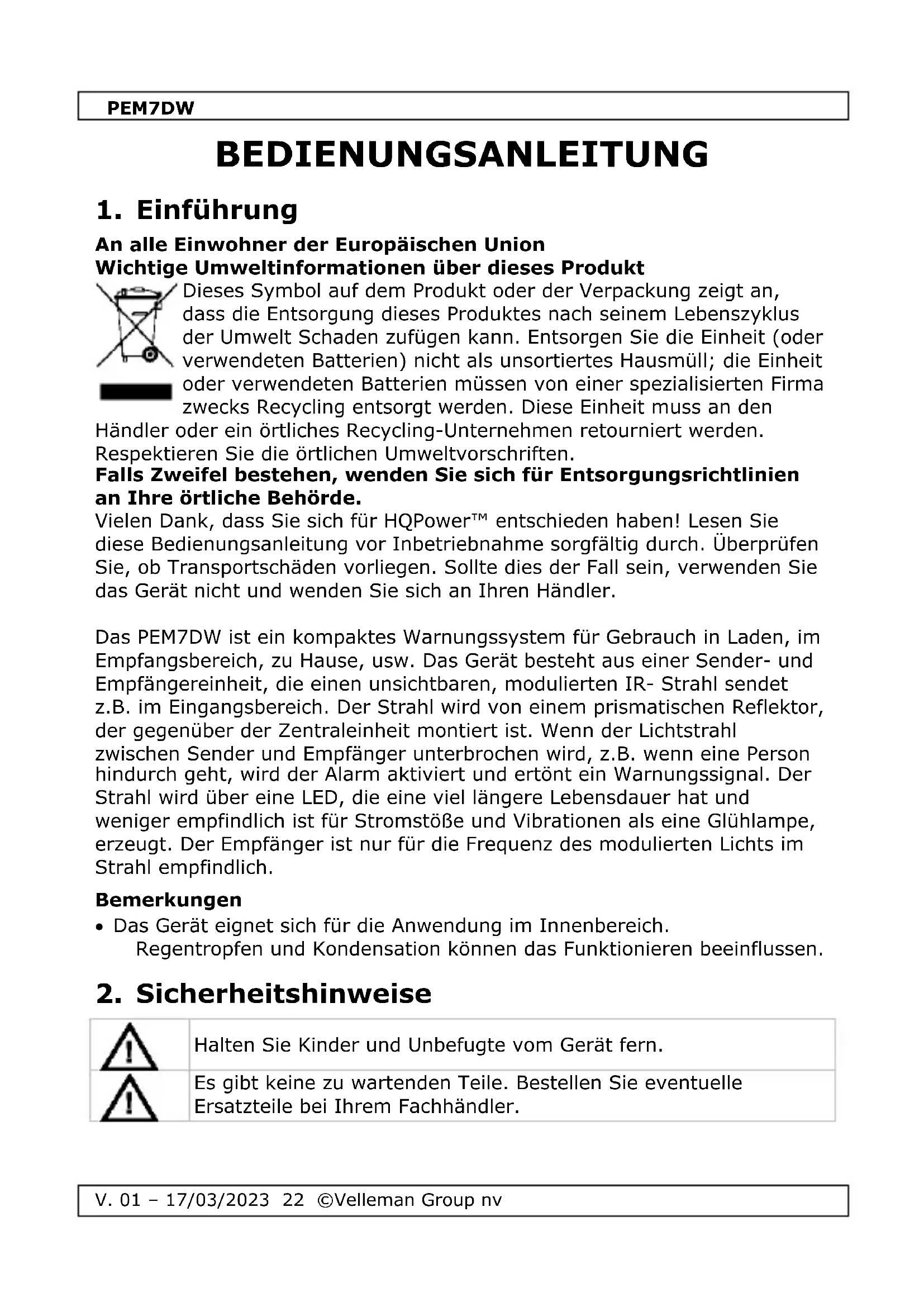 BEDIENUNGSANLEITUNG PEM7DW VELLEMAN