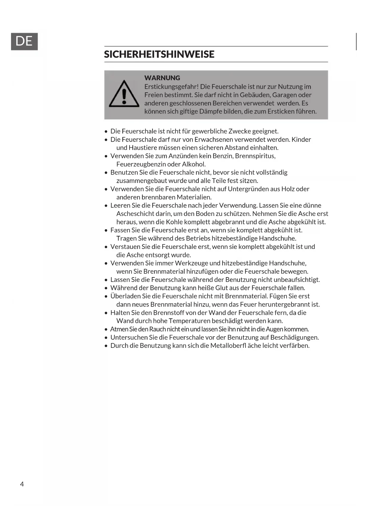 SICHERHEITSHINWEISE WARNUNG Erstickungsgefahr! Die Feuerschale ist nur zur Nutzung im Freien bestimmt. Sie darf nicht in Gebäuden, Garagen oder anderen geschlossenen Bereichen verwendet werden. Es können sich giftige Dämpfe bilden, die zum Ersticken führen.