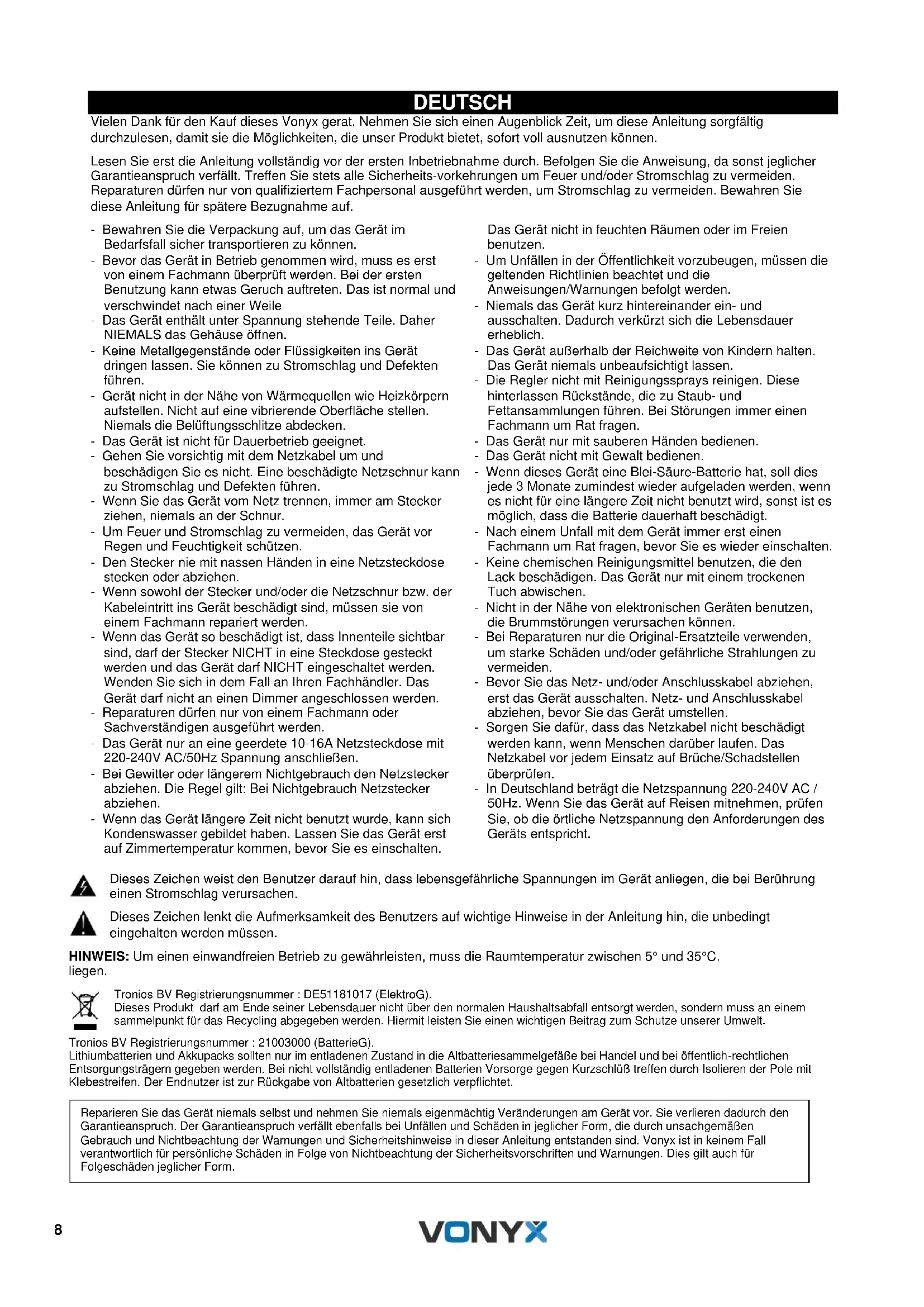 VERVANGEN ZEKERING Indien de zekering defect is, dient u de zekering te vervangen door een zekering van hetzelfde type en waarde. Voor het vervangen van de zekering, schakel eerst de stroom uit en volg de onderstaande stappen. Procedure: Stap 1: Open de zekeringhouder op het achter paneel met een passende platte schroevendraaier. Stap 2: Verwijder de oude zekering uit de zekeringhouder. Stap 3: Installeer de nieuwe zekering in de zekeringhouder. Stap 4: Plaats de zekeringhouder in de behuizing.8 DEUTSCH Vielen Dank für den Kauf dieses Vonyx gerat. Nehmen Sie sich einen Augenblick Zeit, um diese Anleitung sorgfältig durchzulesen, damit sie die Möglichkeiten, die unser Produkt bietet, sofort voll ausnutzen können. Lesen Sie erst die Anleitung vollständig vor der ersten Inbetriebnahme durch. Befolgen Sie die Anweisung, da sonst jeglicher Garantieanspruch verfällt. Treffen Sie stets alle Sicherheits-vorkehrungen um Feuer und/oder Stromschlag zu vermeiden. Reparaturen dürfen nur von qualifiziertem Fachpersonal ausgeführt werden, um Stromschlag zu vermeiden. Bewahren Sie diese Anleitung für spätere Bezugnahme auf. - Bewahren Sie die Verpackung auf, um das Gerät im Bedarfsfall sicher transportieren zu können. - Bevor das Gerät in Betrieb genommen wird, muss es erst von einem Fachmann überprüft werden. Bei der ersten Benutzung kann etwas Geruch auftreten. Das ist normal und verschwindet nach einer Weile - Das Gerät enthält unter Spannung stehende Teile. Daher NIEMALS das Gehäuse öffnen. - Keine Metallgegenstände oder Flüssigkeiten ins Gerät dringen lassen. Sie können zu Stromschlag und Defekten führen. - Gerät nicht in der Nähe von Wärmequellen wie Heizkörpern aufstellen. Nicht auf eine vibrierende Oberfläche stellen. Niemals die Belüftungsschlitze abdecken. - Das Gerät ist nicht für Dauerbetrieb geeignet. - Gehen Sie vorsichtig mit dem Netzkabel um und beschädigen Sie es nicht. Eine beschädigte Netzschnur kann zu Stromschlag und Defekten führen. - Wenn Sie das Gerät vom Netz trennen, immer am Stecker ziehen, niemals an der Schnur. - Um Feuer und Stromschlag zu vermeiden, das Gerät vor Regen und Feuchtigkeit schützen. - Den Stecker nie mit nassen Händen in eine Netzsteckdose stecken oder abziehen. - Wenn sowohl der Stecker und/oder die Netzschnur bzw. der Kabeleintritt ins Gerät beschädigt sind, müssen sie von einem Fachmann repariert werden. - Wenn das Gerät so beschädigt ist, dass Innenteile sichtbar sind, darf der Stecker NICHT in eine Steckdose gesteckt werden und das Gerät darf NICHT eingeschaltet werden. Wenden Sie sich in dem Fall an Ihren Fachhändler. Das Gerät darf nicht an einen Dimmer angeschlossen werden. - Reparaturen dürfen nur von einem Fachmann oder Sachverständigen ausgeführt werden. - Das Gerät nur an eine geerdete 10-16A Netzsteckdose mit 220-240V AC/50Hz Spannung anschließen. - Bei Gewitter oder längerem Nichtgebrauch den Netzstecker abziehen. Die Regel gilt: Bei Nichtgebrauch Netzstecker abziehen. - Wenn das Gerät längere Zeit nicht benutzt wurde, kann sich Kondenswasser gebildet haben. Lassen Sie das Gerät erst auf Zimmertemperatur kommen, bevor Sie es einschalten. Das Gerät nicht in feuchten Räumen oder im Freien benutzen. - Um Unfällen in der Öffentlichkeit vorzubeugen, müssen die geltenden Richtlinien beachtet und die Anweisungen/Warnungen befolgt werden. - Niemals das Gerät kurz hintereinander ein- und ausschalten. Dadurch verkürzt sich die Lebensdauer erheblich. - Das Gerät außerhalb der Reichweite von Kindern halten. Das Gerät niemals unbeaufsichtigt lassen. - Die Regler nicht mit Reinigungssprays reinigen. Diese hinterlassen Rückstände, die zu Staub- und Fettansammlungen führen. Bei Störungen immer einen Fachmann um Rat fragen. - Das Gerät nur mit sauberen Händen bedienen. - Das Gerät nicht mit Gewalt bedienen. - Wenn dieses Gerät eine Blei-Säure-Batterie hat, soll dies jede 3 Monate zumindest wieder aufgeladen werden, wenn es nicht für eine längere Zeit nicht benutzt wird, sonst ist es möglich, dass die Batterie dauerhaft beschädigt. - Nach einem Unfall mit dem Gerät immer erst einen Fachmann um Rat fragen, bevor Sie es wieder einschalten. - Keine chemischen Reinigungsmittel benutzen, die den Lack beschädigen. Das Gerät nur mit einem trockenen Tuch abwischen. - Nicht in der Nähe von elektronischen Geräten benutzen, die Brummstörungen verursachen können. - Bei Reparaturen nur die Original-Ersatzteile verwenden, um starke Schäden und/oder gefährliche Strahlungen zu vermeiden. - Bevor Sie das Netz- und/oder Anschlusskabel abziehen, erst das Gerät ausschalten. Netz- und Anschlusskabel abziehen, bevor Sie das Gerät umstellen. - Sorgen Sie dafür, dass das Netzkabel nicht beschädigt werden kann, wenn Menschen darüber laufen. Das Netzkabel vor jedem Einsatz auf Brüche/Schadstellen überprüfen. - In Deutschland beträgt die Netzspannung 220-240V AC / 50Hz. Wenn Sie das Gerät auf Reisen mitnehmen, prüfen Sie, ob die örtliche Netzspannung den Anforderungen des Geräts entspricht. Dieses Zeichen weist den Benutzer darauf hin, dass lebensgefährliche Spannungen im Gerät anliegen, die bei Berührung einen Stromschlag verursachen. Dieses Zeichen lenkt die Aufmerksamkeit des Benutzers auf wichtige Hinweise in der Anleitung hin, die unbedingt eingehalten werden müssen. HINWEIS: Um einen einwandfreien Betrieb zu gewährleisten, muss die Raumtemperatur zwischen 5° und 35°C. liegen. Tronios BV Registrierungsnummer : DE51181017 (ElektroG). Dieses Produkt darf am Ende seiner Lebensdauer nicht über den normalen Haushaltsabfall entsorgt werden, sondern muss an einem sammelpunkt für das Recycling abgegeben werden. Hiermit leisten Sie einen wichtigen Beitrag zum Schutze unserer Umwelt. Tronios BV Registrierungsnummer : 21003000 (BatterieG). Lithiumbatterien und Akkupacks sollten nur im entladenen Zustand in die Altbatteriesammelgefäße bei Handel und bei öffentlich-rechtlichen Entsorgung