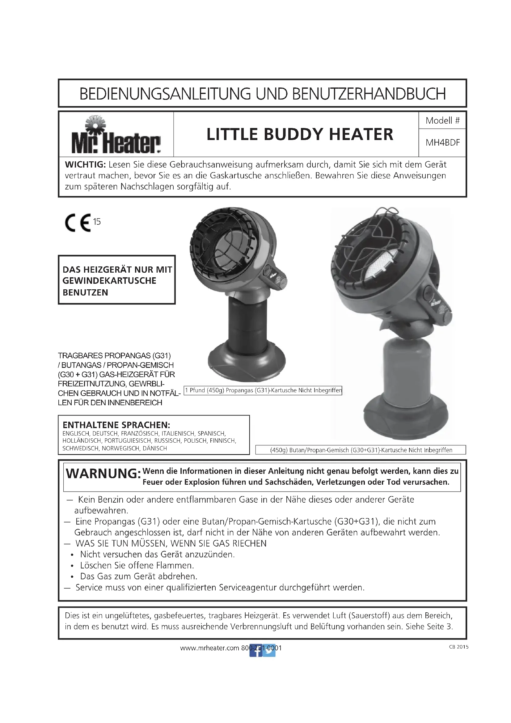 Mr. Heater, Inc. behält sich das Recht vor, Änderungen jederzeit und ohne vorherige Ankündigung, in Farben, Spezifikationen, Zubehör, Materialien und Modellen vor- zunehmen. WARNUNG: NUR ERSATZTEILE VOM HERSTELLER VERWENDEN. GEBRAUCH VON ANDEREN ERSATZTEILEN KANN ZU VERLETZUNGEN ODER TOD FÜHREN. ERSATZTEILE SIND NUR DIREKT VON DER FABRIK ERHÄLTLICH UND MÜSSEN VON EINER QUALIFIZIERTEN SERVICEAGENTUR INSTALLIERT WERDEN. INFORMATION ZUR ERSATZTEILBESTELLUNG: EINKAUF: Zubehörteile können durch www.mrheater.com und von lokalen Händlern erworben werden FÜR INFORMATION IN BEZUG ZU EINEM SERVICEBESUCH: WWW.mrheater.com Unsere Bürostunden sind 8:00 Uhr – 17:00 Uhr, EST, Montag bis Freitag. Sie können sich mit einem Mitarbeiter des technischen Kundendienstes über die Webseite unterhalten: www.mrheater.com Geben Sie bitte Modellnummer, Kaufdatum und Beschreibung des Problems an. BEGRENZTE GARANTIE Mr. Heater, Inc. gewährleistet seine Heizgeräte und Zubehör frei von Material- und Herstellungsfehler für einen Zeitraum von 1 Jahr ab Kaufdatum. Mr. Heater, Inc. repariert oder ersetzt dieses Produkt kostenlos, wenn die Beschädigung innerhalb des 1-Jahreszeitraums erwiesen wurde und mit Kaufbeleg zum Fachhändler zurückgebracht wird. DIE ANWEISUNGEN SORGFÄLTIG DURCHLESEN: Lesen und befolgen Sie alle Anweisungen. Die An- weisungen für spätere Bezugnahme an einem sicheren Ort aufbewahren. Erlauben Sie niemandem, der diese Anweisungen nicht gelesen hat, das Heizgerät zusammenzubauen, anzuzünden oder einzustellen. MH4BDF Modell # PRODUKTREGISTRIERUNG: Danke für Ihren Einkauf. Bitte loggen Sie sich bei http://www.egiregistration.com ein, um Ihr Produkt zu registrieren. LITTLE BUDDY HEATERwww.mrheater.com 800-251-0001 CB 2015
