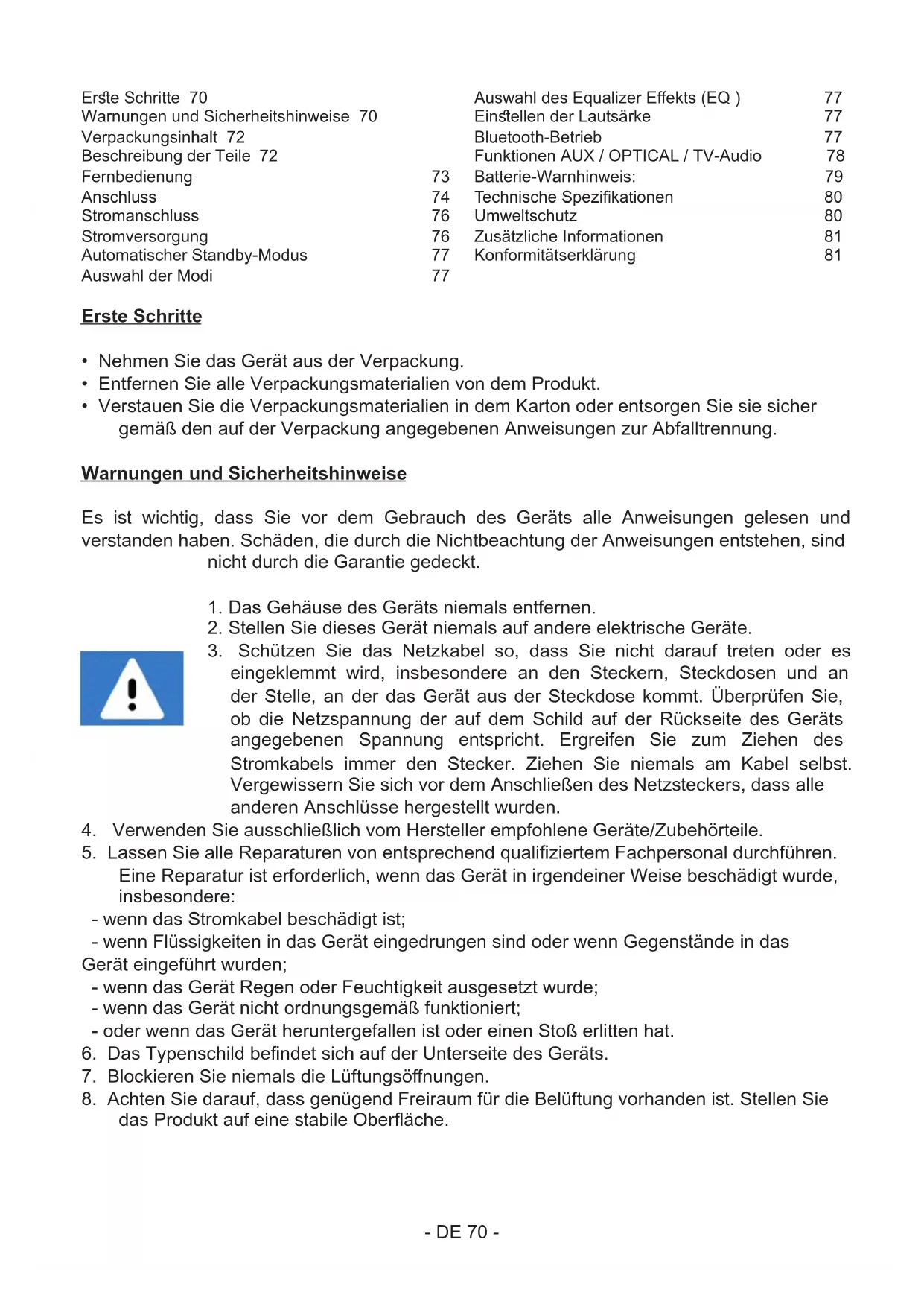 das Produkt auf eine abile Oberäche. Ere Schritte 70 Warnungen und Sicherheitshinweise 70 Verpackungsinhalt 72 Beschreibung der Teile 72 Fernbedienung 73 Anschluss 74 Stromanschluss 76 Stromversorgung 76 Automatischer Standby-Modus 77 Auswahl der Modi 77 Auswahl des Equalizer Eekts (EQ ) 77 Einellen der Lautsärke 77 Bluetooth-Betrieb 77 Funktionen AUX / OPTICAL / TV-Audio 78 Batterie-Warnhinweis: 79 Technische Spezikationen 80 Umweltschutz 80 Zusätzliche Informationen 81 Konformitätserklärung 81- DE 71 -