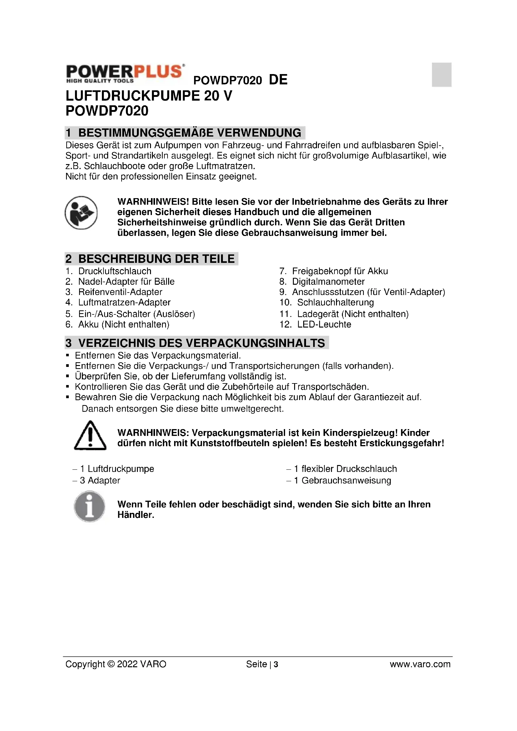- Bewahren Sie die Verpackung nach Möglichkeit bis zum Ablauf der Garantiezeit auf. Danach entsorgen Sie diese bitte umweltgerecht. WARNHINWEIS: Verpackungsmaterial ist kein Kinderspielzeug! Kinder dürfen nicht mit Kunststoffbeuteln spielen! Es besteht Erstickungsgefahr! − 1 Luftdruckpumpe − 3 Adapter − 1 flexibler Druckschlauch − 1 Gebrauchsanweisung Wenn Teile fehlen oder beschädigt sind, wenden Sie sich bitte an Ihren Händler.POWDP7020 DE Copyright © 2022 VARO Seite | 4 www.varo.com