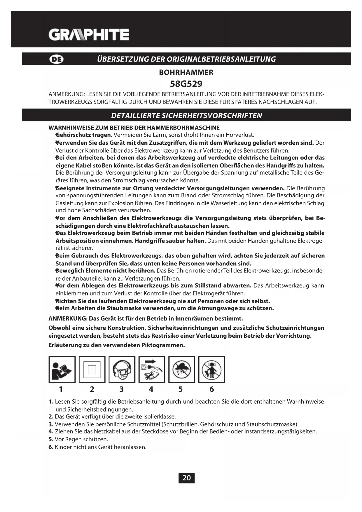 BOHRHAMMER 58G529 ANMERKUNG: LESEN SIE DIE VORLIEGENDE BETRIEBSANLEITUNG VOR DER INBETRIEBNAHME DIESES ELEK- TROWERKZEUGS SORGFÄLTIG DURCH UND BEWAHREN SIE DIESE FÜR SPÄTERES NACHSCHLAGEN AUF. DETAILLIERTE SICHERHEITSVORSCHRIFTEN