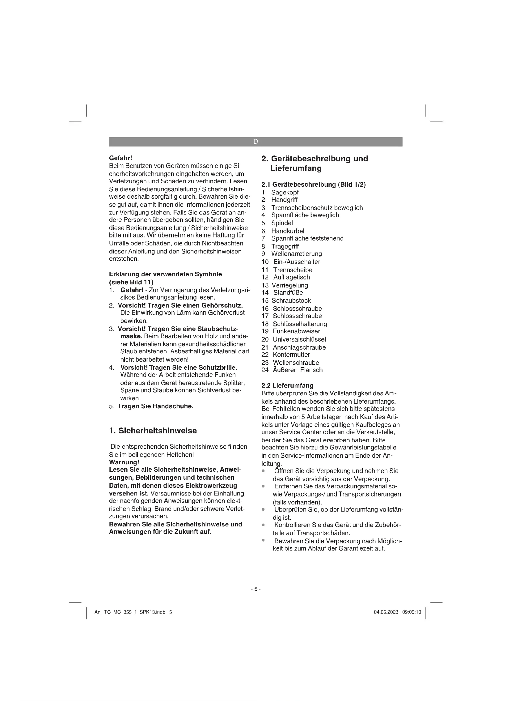 1 Sägekopf 2 Handgriff 3 Trennscheibenschutz beweglich 4 Spannfl äche beweglich 5 Spindel 6 Handkurbel 7 Spannfl äche feststehend 8 Tragegriff 9 Wellenarretierung 10 Ein-/Ausschalter 11 Trennscheibe 12 Aufl agetisch 13 Verriegelung 14 Standfüße 15 Schraubstock 16 Schlossschraube 17 Schlossschraube 18 Schlüsselhalterung 19 Funkenabweiser 20 Universalschlüssel 21 Anschlagschraube 22 Kontermutter 23 Wellenschraube 24 Äußerer Flansch