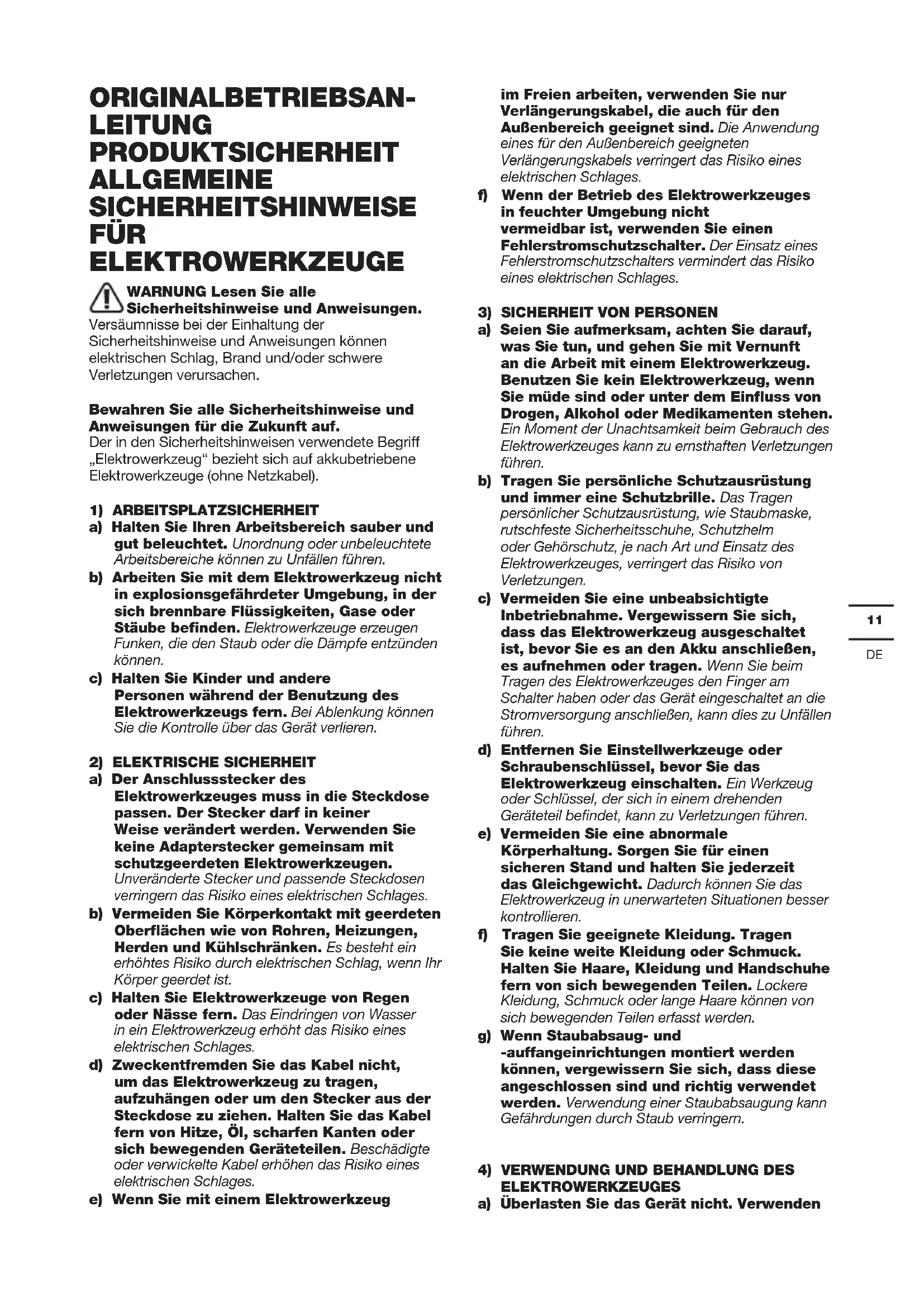 ORIGINALBETRIEBSAN- LEITUNG PRODUKTSICHERHEIT ALLGEMEINE SICHERHEITSHINWEISE FÜR ELEKTROWERKZEUGE WARNUNG Lesen Sie alle Sicherheitshinweise und Anweisungen. Versäumnisse bei der Einhaltung der Sicherheitshinweise und Anweisungen können elektrischen Schlag, Brand und/oder schwere Verletzungen verursachen. Bewahren Sie alle Sicherheitshinweise und Anweisungen für die Zukunft auf. Der in den Sicherheitshinweisen verwendete Begriff „Elektrowerkzeug“ bezieht sich auf akkubetriebene Elektrowerkzeuge (ohne Netzkabel).