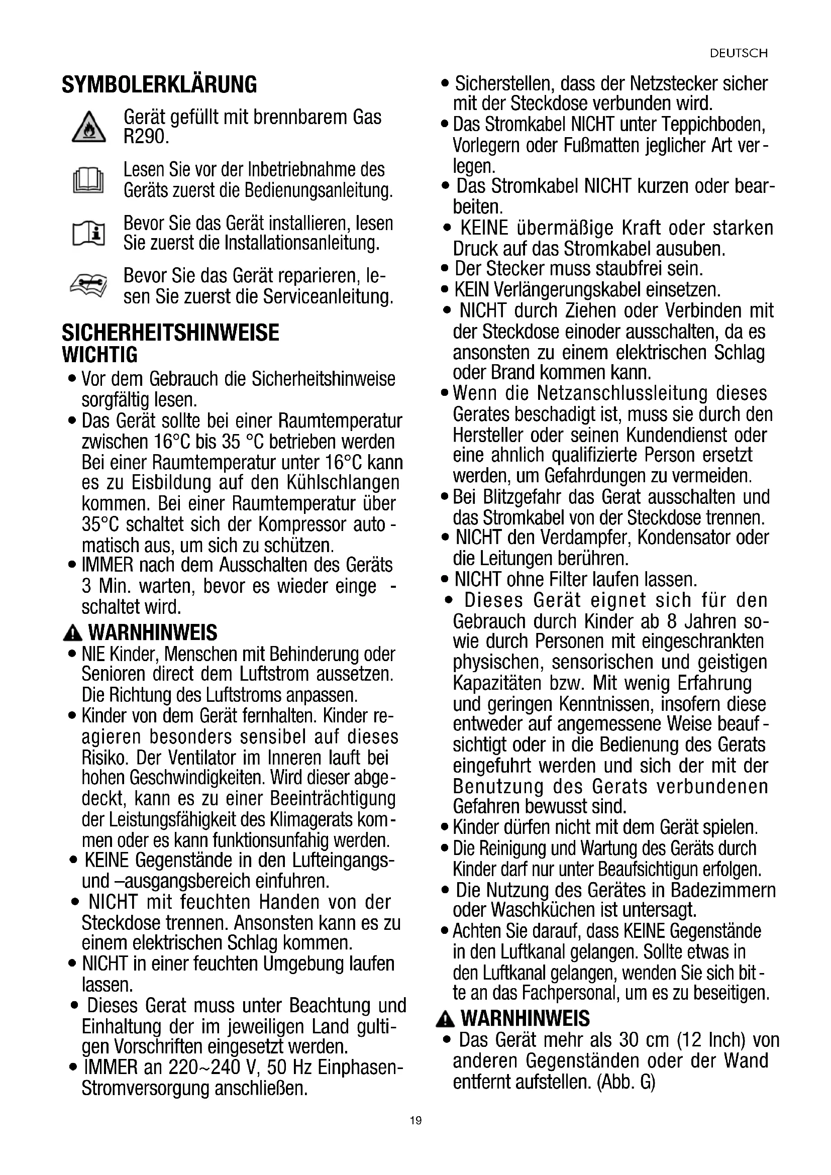 weltfreundliches Recycling verwenden. R290: 3 DEUTSCH21 ÜBERSICHT Dieses Gerät ist für eine örtlich begrenzte Abgabe von kühler Luft bestimmt. Das Gerät sorgt für mehr persönlichen Komfort, egal ob am Arbeitsplatz oder in Ihrem Lieblingssessel. Die (4) Rollfüße ermöglichen einen problemlosen Transport des Geräts von einem Raum in einen anderen. Die Luft wird gleichzei- tig gekühlt und getrocknet, sodass Sie auch bei feuchtem oder regnerischem Wetter ein angenehmes Wohnklima genießen kön- nen. Bei einem Einsatz als Luftentfeuchter bleiben Ihre Möbel und Stoffe in einem einwandfreien Zustand. Herkömmliche Klimageräte verbrauchen viel Strom, um ganze Räume zu kühlen, einschließlich Wänden und Möbeln. Dieses Gerät sorgt ausschließlich genau innerhalb des gewünschten Bereichs für kühle und trockene Luft. Auf diese Weise wird keine Energie für die Kühlung der Umgebung verschwendet. Es lässt sich sehr einfach bedienen. Über den eingebauten Timer kann eine Einsatzdauer zwischen 0.5 bis 24 Stunden eingestellt werden, wobei das Gerät automatisch ein- und ausgeschaltet wird. Zur Schlafenszeit ist der Ruhemodus praktisch. Wenn Sie die voreingestellte Temperatur allmählich steigern, schlafen Sie komfortabler. Eine Entlüftung ist nicht erforderlich. Wenn das Gerät jedoch aus- schließlich in einem Raum eingesetzt werden soll, kann die Kühlwirkung durch den Einsatz des Entlüftungskits verstärkt wer- den, der im Lieferumfang inbegriffen ist. BETRIEBSEIGENSCHAFTEN