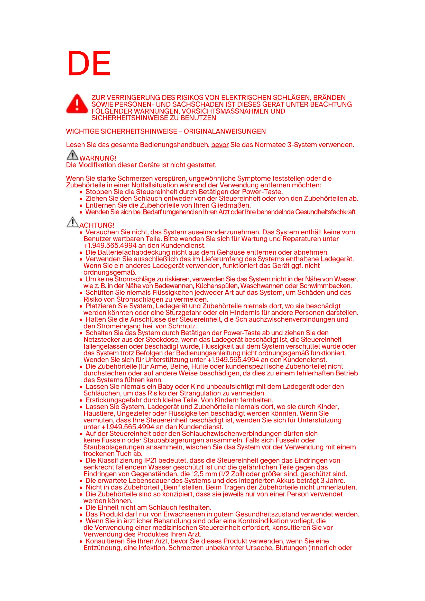 Lesen Sie das gesamte Bedienungshandbuch, bevor Sie das Normatec 3-System verwenden. WARNUNG! Die Modifikation dieser Geräte ist nicht gestattet. Wenn Sie starke Schmerzen verspüren, ungewöhnliche Symptome feststellen oder die Zubehörteile in einer Notfallsituation während der Verwendung entfernen möchten: