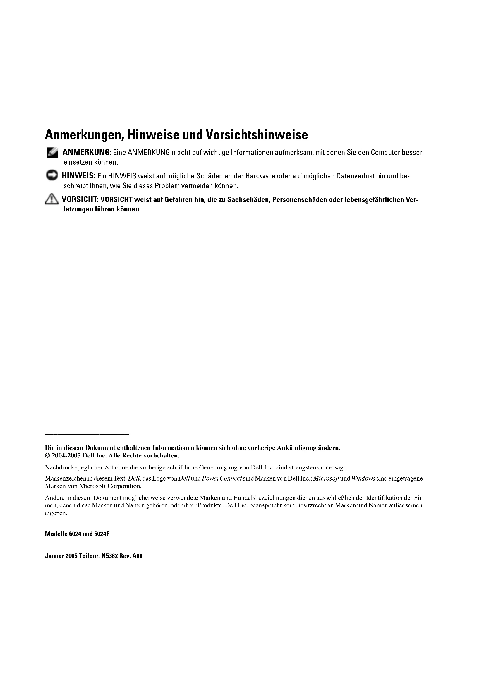 Die in diesem Dokument enthaltenen Informationen können sich ohne vorherige Ankündigung ändern. © 2004-2005 Dell Inc. Alle Rechte vorbehalten. Nachdrucke jeglicher Art ohne die vorherige schriftliche Genehmigung von Dell Inc. sind strengstens untersagt. Markenzeichen in diesem Text: Dell, das Logo von Dell und PowerConnect sind Marken von Dell Inc.; Microsoft und Windows sind eingetragene Marken von Microsoft Corporation. Andere in diesem Dokument möglicherweise verwendete Marken und Handelsbezeichnungen dienen ausschließlich der Identifikation der Fir- men, denen diese Marken und Namen gehören, oder ihrer Produkte. Dell Inc. beansprucht kein Besitzrecht an Marken und Namen außer seinen eigenen. Modelle 6024 und 6024F Januar 2005 Teilenr. N5382 Rev. A01Handbuch zum Einstieg 63 Installation Übersicht Dieses Dokument stellt die grundlegenden Informationen zur Installation, Konfiguration und zum Betrieb des Dell™ PowerConnect™ 6024 und 6024F Systems bereit. Weitere Informationen finden Sie im Benutzerhandbuch , das Ihnen auf der Dokumentations -CD zur Verfügung steht, oder besu- chen Sie die Dell Support-Website über support.dell.com , um Informationen über die neuesten Aktualisierungen für die Dokumentation und die Software zu erhalten. Vorbereitung des Standorts PowerConnect 60