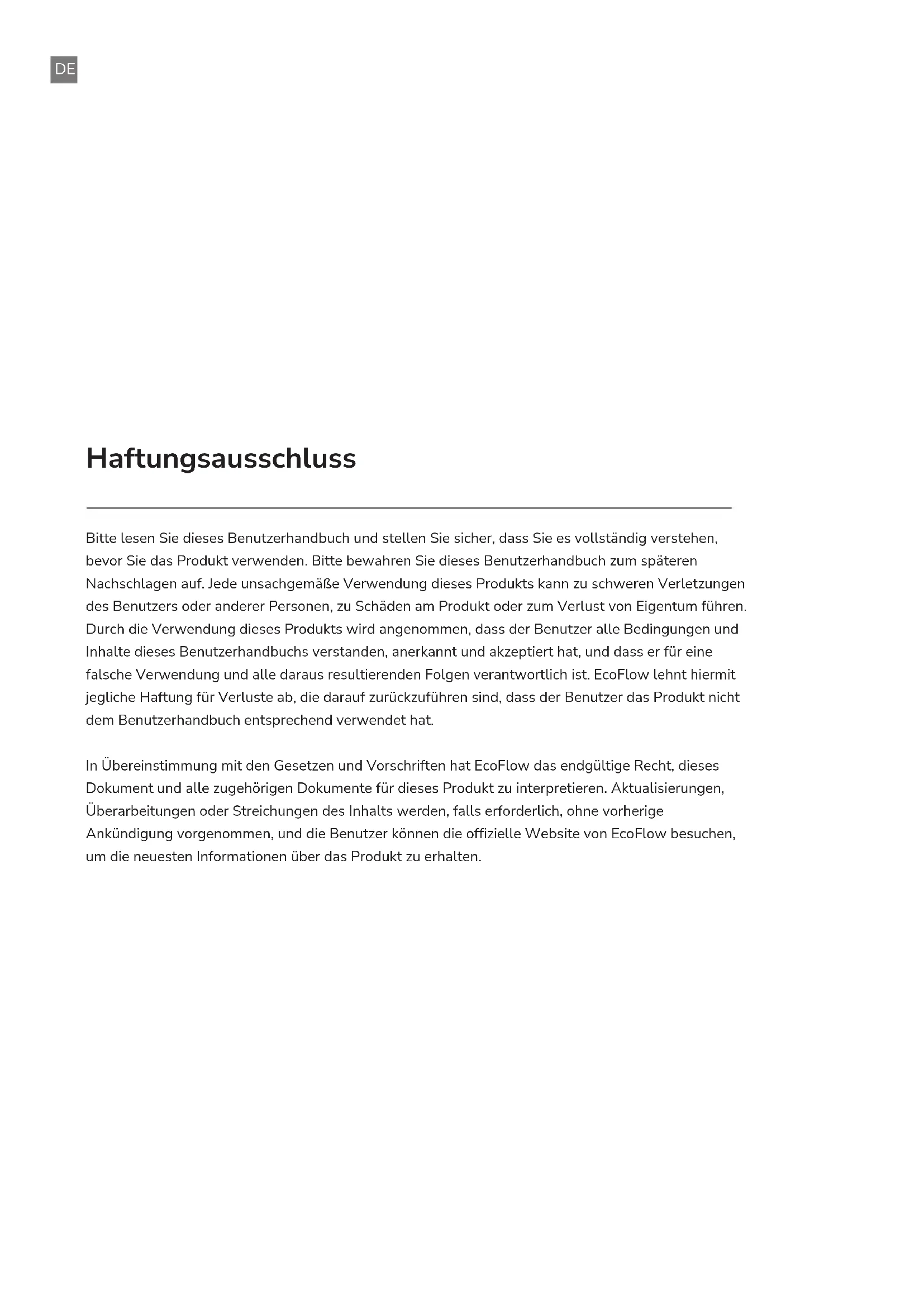 8.DE Bitte lesen Sie dieses Benutzerhandbuch und stellen Sie sicher, dass Sie es vollständig verstehen, bevor Sie das Produkt verwenden. Bitte bewahren Sie dieses Benutzerhandbuch zum späteren Nachschlagen auf. Jede unsachgemäße Verwendung dieses Produkts kann zu schweren Verletzungen des Benutzers oder anderer Personen, zu Schäden am Produkt oder zum Verlust von Eigentum führen. Durch die Verwendung dieses Produkts wird angenommen, dass der Benutzer alle Bedingungen und Inhalte dieses Benutzerhandbuchs verstanden, anerkannt und akzeptiert hat, und dass er für eine falsche Verwendung und alle daraus resultierenden Folgen verantwortlich ist. EcoFlow lehnt hiermit jegliche Haftung für Verluste ab, die darauf zurückzuführen sind, dass der Benutzer das Produkt nicht dem Benutzerhandbuch entsprechend verwendet hat. In Übereinstimmung mit den Gesetzen und Vorschriften hat EcoFlow das endgültige Recht, dieses Dokument und alle zugehörigen Dokumente für dieses Produkt zu interpretieren. Aktualisierungen, Überarbeitungen oder Streichungen des Inhalts werden, falls erforderlich, ohne vorherige Ankündigung vorgenommen, und die Benutzer können die offizielle Website von EcoFlow besuchen, um die neuesten Informationen über das Produkt zu erhalten. Haftungsausschluss1