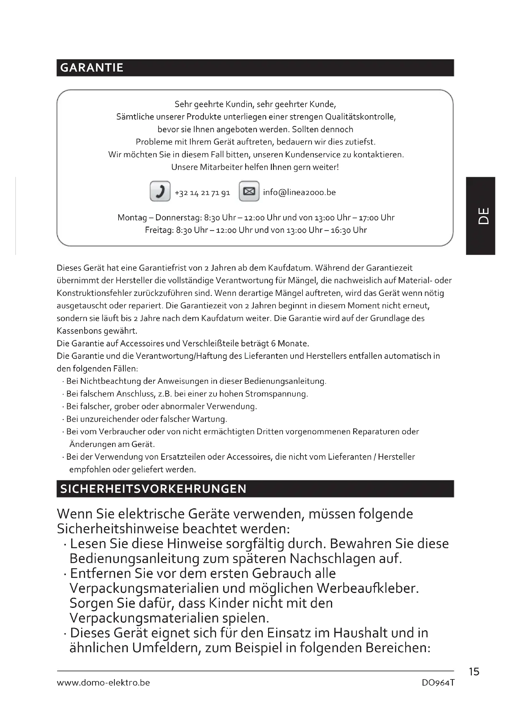 GARANTIE Sehr geehrte Kundin, sehr geehrter Kunde, Sämtliche unserer Produkte unterliegen einer strengen Qualitätskontrolle, bevor sie Ihnen angeboten werden. Sollten dennoch Probleme mit Ihrem Gerät auftreten, bedauern wir dies zutiefst. Wir möchten Sie in diesem Fall bitten, unseren Kundenservice zu kontaktieren. Unsere Mitarbeiter helfen Ihnen gern weiter! +32 14 21 71 91 info@linea2000.be Montag – Donnerstag: 8:30 Uhr – 12:00 Uhr und von 13:00 Uhr – 17:00 Uhr Freitag: 8:30 Uhr – 12:00 Uhr und von 13:00 Uhr – 16:30 Uhr Dieses Gerät hat eine Garantiefrist von 2 Jahren ab dem Kaufdatum. Während der Garantiezeit übernimmt der Hersteller die vollständige Verantwortung für Mängel, die nachweislich auf Material- oder Konstruktionsfehler zurückzuführen sind. Wenn derartige Mängel auftreten, wird das Gerät wenn nötig ausgetauscht oder repariert. Die Garantiezeit von 2 Jahren beginnt in diesem Moment nicht erneut, sondern sie läuft bis 2 Jahre nach dem Kaufdatum weiter. Die Garantie wird auf der Grundlage des Kassenbons gewährt. Die Garantie auf Accessoires und Verschleißteile beträgt 6 Monate. Die Garantie und die Verantwortung/Haftung des Lieferanten und Herstellers entfallen automatisch in den folgenden Fällen: