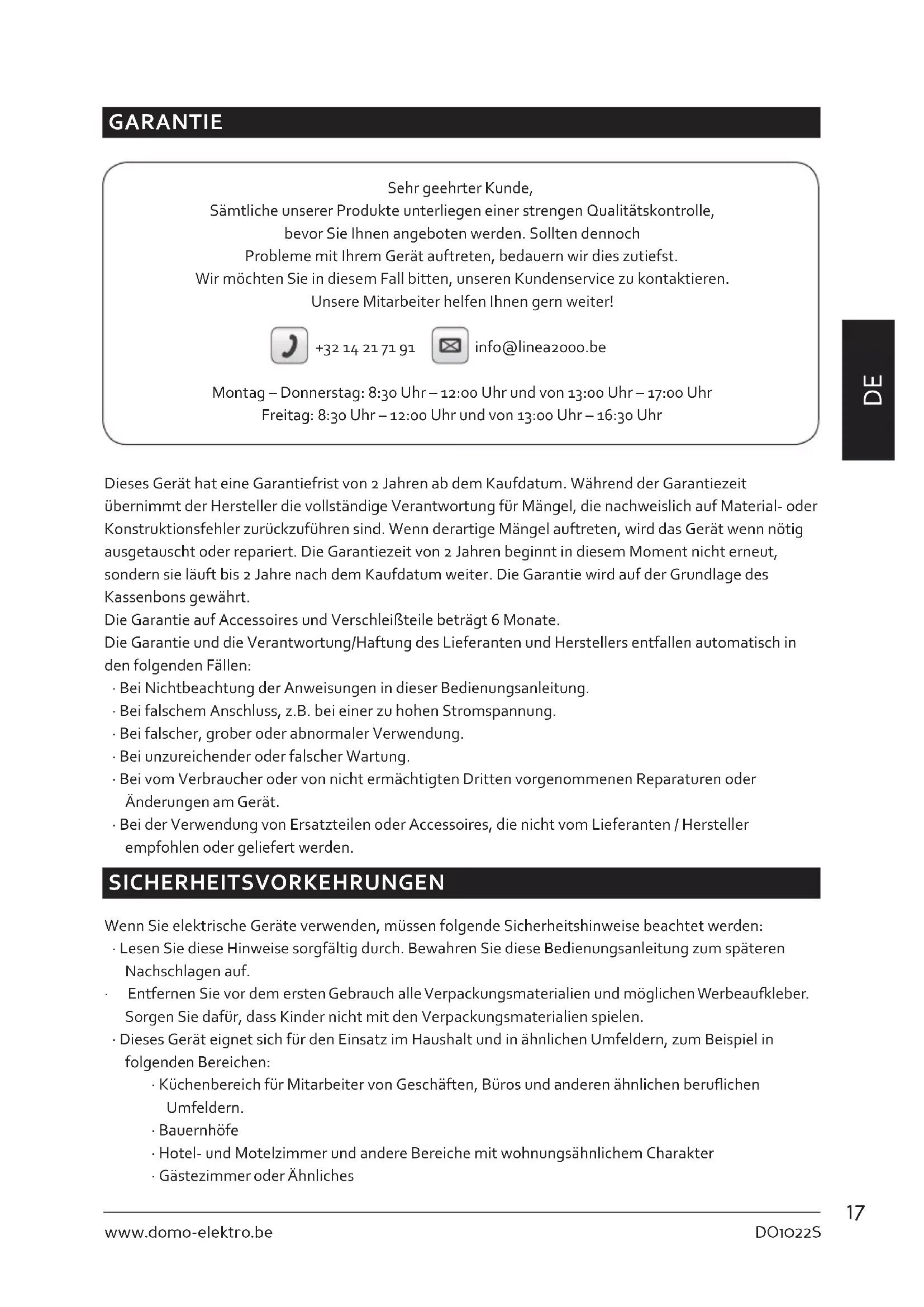 GARANTIE Sehr geehrter Kunde, Sämtliche unserer Produkte unterliegen einer strengen Qualitätskontrolle, bevor Sie Ihnen angeboten werden. Sollten dennoch Probleme mit Ihrem Gerät auftreten, bedauern wir dies zutiefst. Wir möchten Sie in diesem Fall bitten, unseren Kundenservice zu kontaktieren. Unsere Mitarbeiter helfen Ihnen gern weiter! +32 14 21 71 91 info@linea2000.be Montag – Donnerstag: 8:30 Uhr – 12:00 Uhr und von 13:00 Uhr – 17:00 Uhr Freitag: 8:30 Uhr – 12:00 Uhr und von 13:00 Uhr – 16:30 Uhr Dieses Gerät hat eine Garantiefrist von 2 Jahren ab dem Kaufdatum. Während der Garantiezeit übernimmt der Hersteller die vollständige Verantwortung für Mängel, die nachweislich auf Material- oder Konstruktionsfehler zurückzuführen sind. Wenn derartige Mängel auftreten, wird das Gerät wenn nötig ausgetauscht oder repariert. Die Garantiezeit von 2 Jahren beginnt in diesem Moment nicht erneut, sondern sie läuft bis 2 Jahre nach dem Kaufdatum weiter. Die Garantie wird auf der Grundlage des Kassenbons gewährt. Die Garantie auf Accessoires und Verschleißteile beträgt 6 Monate. Die Garantie und die Verantwortung/Haftung des Lieferanten und Herstellers entfallen automatisch in den folgenden Fällen: