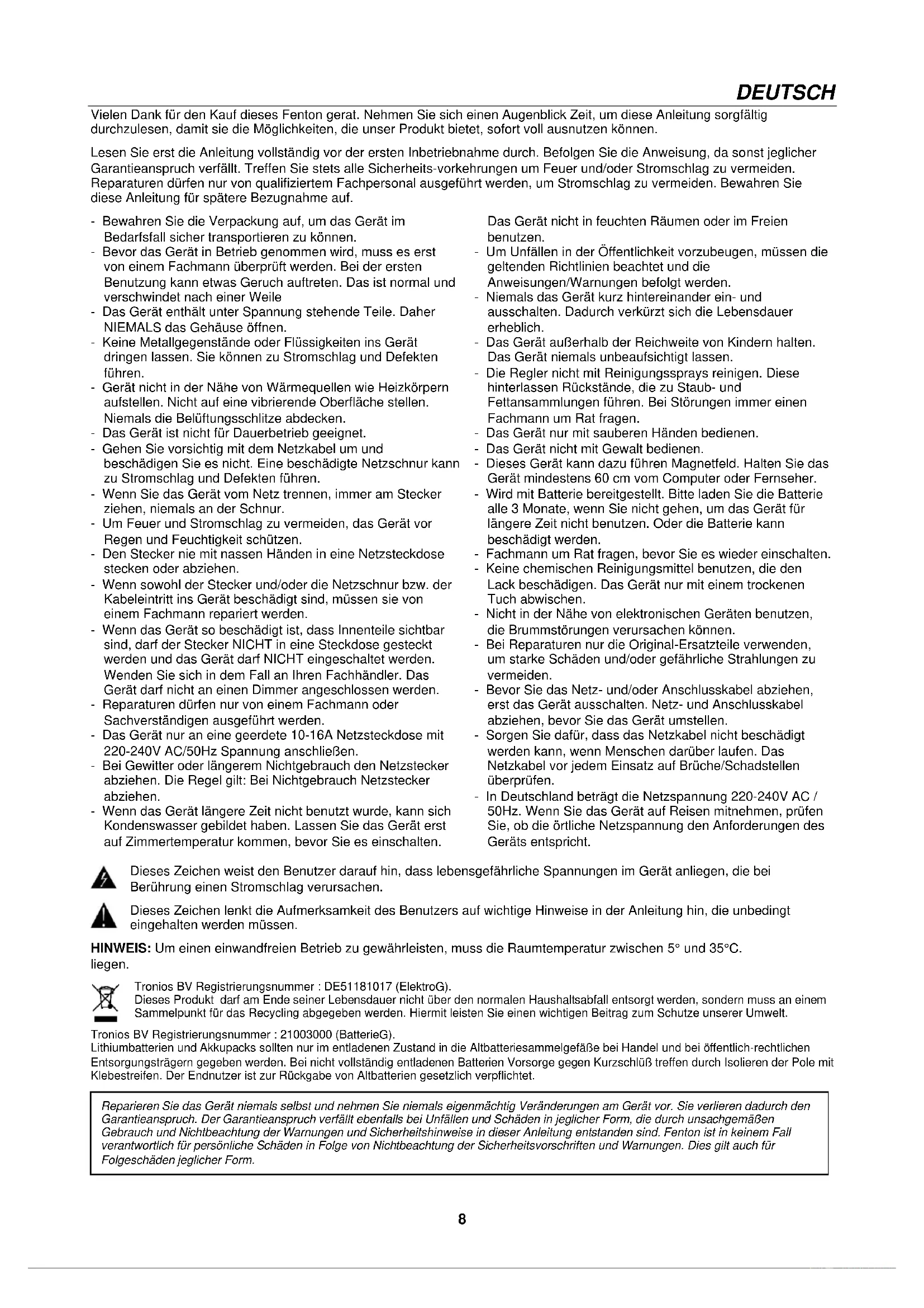 AUX IN U kunt via de radio naar de muziek luisteren die op een ander audioapparaat of smartphone is opgeslagen, via de 3,5 mm aux- in aansluiting aan de voorkant. Gebruik een kabel met 3,5 mm aansluitpennen aan beide uiteinden, het ene uiteinde aangesloten op de aux-in aansluiting van de radio, het andere uiteinde aangesloten op de oortelefoonaansluiting van het audioapparaat (of lijnuitgang indien beschikbaar). Zet de modusschakelaar op AUX-modus. Speel muziek af op het aangesloten apparaat, het geluid zal worden weergegeven door de radio.8 DEUTSCH Vielen Dank für den Kauf dieses Fenton gerat. Nehmen Sie sich einen Augenblick Zeit, um diese Anleitung sorgfältig durchzulesen, damit sie die Möglichkeiten, die unser Produkt bietet, sofort voll ausnutzen können. Lesen Sie erst die Anleitung vollständig vor der ersten Inbetriebnahme durch. Befolgen Sie die Anweisung, da sonst jeglicher Garantieanspruch verfällt. Treffen Sie stets alle Sicherheits-vorkehrungen um Feuer und/oder Stromschlag zu vermeiden. Reparaturen dürfen nur von qualifiziertem Fachpersonal ausgeführt werden, um Stromschlag zu vermeiden. Bewahren Sie diese Anleitung für spätere Bezugnahme auf. - Bewahren Sie die Verpackung auf, um das Gerät im Bedarfsfall sicher transportieren zu können. - Bevor das Gerät in Betrieb genommen wird, muss es erst von einem Fachmann überprüft werden. Bei der ersten Benutzung kann etwas Geruch auftreten. Das ist normal und verschwindet nach einer Weile - Das Gerät enthält unter Spannung stehende Teile. Daher NIEMALS das Gehäuse öffnen. - Keine Metallgegenstände oder Flüssigkeiten ins Gerät dringen lassen. Sie können zu Stromschlag und Defekten führen. - Gerät nicht in der Nähe von Wärmequellen wie Heizkörpern aufstellen. Nicht auf eine vibrierende Oberfläche stellen. Niemals die Belüftungsschlitze abdecken. - Das Gerät ist nicht für Dauerbetrieb geeignet. - Gehen Sie vorsichtig mit dem Netzkabel um und beschädigen Sie es nicht. Eine beschädigte Netzschnur kann zu Stromschlag und Defekten führen. - Wenn Sie das Gerät vom Netz trennen, immer am Stecker ziehen, niemals an der Schnur. - Um Feuer und Stromschlag zu vermeiden, das Gerät vor Regen und Feuchtigkeit schützen. - Den Stecker nie mit nassen Händen in eine Netzsteckdose stecken oder abziehen. - Wenn sowohl der Stecker und/oder die Netzschnur bzw. der Kabeleintritt ins Gerät beschädigt sind, müssen sie von einem Fachmann repariert werden. - Wenn das Gerät so beschädigt ist, dass Innenteile sichtbar sind, darf der Stecker NICHT in eine Steckdose gesteckt werden und das Gerät darf NICHT eingeschaltet werden. Wenden Sie sich in dem Fall an Ihren Fachhändler. Das Gerät darf nicht an einen Dimmer angeschlossen werden. - Reparaturen dürfen nur von einem Fachmann oder Sachverständigen ausgeführt werden. - Das Gerät nur an eine geerdete 10-16A Netzsteckdose mit 220-240V AC/50Hz Spannung anschließen. - Bei Gewitter oder längerem Nichtgebrauch den Netzstecker abziehen. Die Regel gilt: Bei Nichtgebrauch Netzstecker abziehen. - Wenn das Gerät längere Zeit nicht benutzt wurde, kann sich Kondenswasser gebildet haben. Lassen Sie das Gerät erst auf Zimmertemperatur kommen, bevor Sie es einschalten. Das Gerät nicht in feuchten Räumen oder im Freien benutzen. - Um Unfällen in der Öffentlichkeit vorzubeugen, müssen die geltenden Richtlinien beachtet und die Anweisungen/Warnungen befolgt werden. - Niemals das Gerät kurz hintereinander ein- und ausschalten. Dadurch verkürzt sich die Lebensdauer erheblich. - Das Gerät außerhalb der Reichweite von Kindern halten. Das Gerät niemals unbeaufsichtigt lassen. - Die Regler nicht mit Reinigungssprays reinigen. Diese hinterlassen Rückstände, die zu Staub- und Fettansammlungen führen. Bei Störungen immer einen Fachmann um Rat fragen. - Das Gerät nur mit sauberen Händen bedienen. - Das Gerät nicht mit Gewalt bedienen. - Dieses Gerät kann dazu führen Magnetfeld. Halten Sie das Gerät mindestens 60 cm vom Computer oder Fernseher. - Wird mit Batterie bereitgestellt. Bitte laden Sie die Batterie alle 3 Monate, wenn Sie nicht gehen, um das Gerät für längere Zeit nicht benutzen. Oder die Batterie kann beschädigt werden. - Fachmann um Rat fragen, bevor Sie es wieder einschalten. - Keine chemischen Reinigungsmittel benutzen, die den Lack beschädigen. Das Gerät nur mit einem trockenen Tuch abwischen. - Nicht in der Nähe von elektronischen Geräten benutzen, die Brummstörungen verursachen können. - Bei Reparaturen nur die Original-Ersatzteile verwenden, um starke Schäden und/oder gefährliche Strahlungen zu vermeiden. - Bevor Sie das Netz- und/oder Anschlusskabel abziehen, erst das Gerät ausschalten. Netz- und Anschlusskabel abziehen, bevor Sie das Gerät umstellen. - Sorgen Sie dafür, dass das Netzkabel nicht beschädigt werden kann, wenn Menschen darüber laufen. Das Netzkabel vor jedem Einsatz auf Brüche/Schadstellen überprüfen. - In Deutschland beträgt die Netzspannung 220-240V AC / 50Hz. Wenn Sie das Gerät auf Reisen mitnehmen, prüfen Sie, ob die örtliche Netzspannung den Anforderungen des Geräts entspricht. Dieses Zeichen weist den Benutzer darauf hin, dass lebensgefährliche Spannungen im Gerät anliegen, die bei Berührung einen Stromschlag verursachen. Dieses Zeichen lenkt die Aufmerksamkeit des Benutzers auf wichtige Hinweise in der Anleitung hin, die unbedingt eingehalten werden müssen. HINWEIS: Um einen einwandfreien Betrieb zu gewährleisten, muss die Raumtemperatur zwischen 5° und 35°C. liegen. Tronios BV Registrierungsnummer : DE51181017 (ElektroG). Dieses Produkt darf am Ende seiner Lebensdauer nicht über den normalen Haushaltsabfall entsorgt werden, sondern muss an einem Sammelpunkt für das Recycling abgegeben werden. Hiermit leisten Sie einen wichtigen Beitrag zum Schutze unserer Umwelt. Tronios BV Registrierungsnummer : 21003000 (BatterieG). Lithiumbatterien und Akkupacks sollten nur im entladenen Zustand in die Altbatt