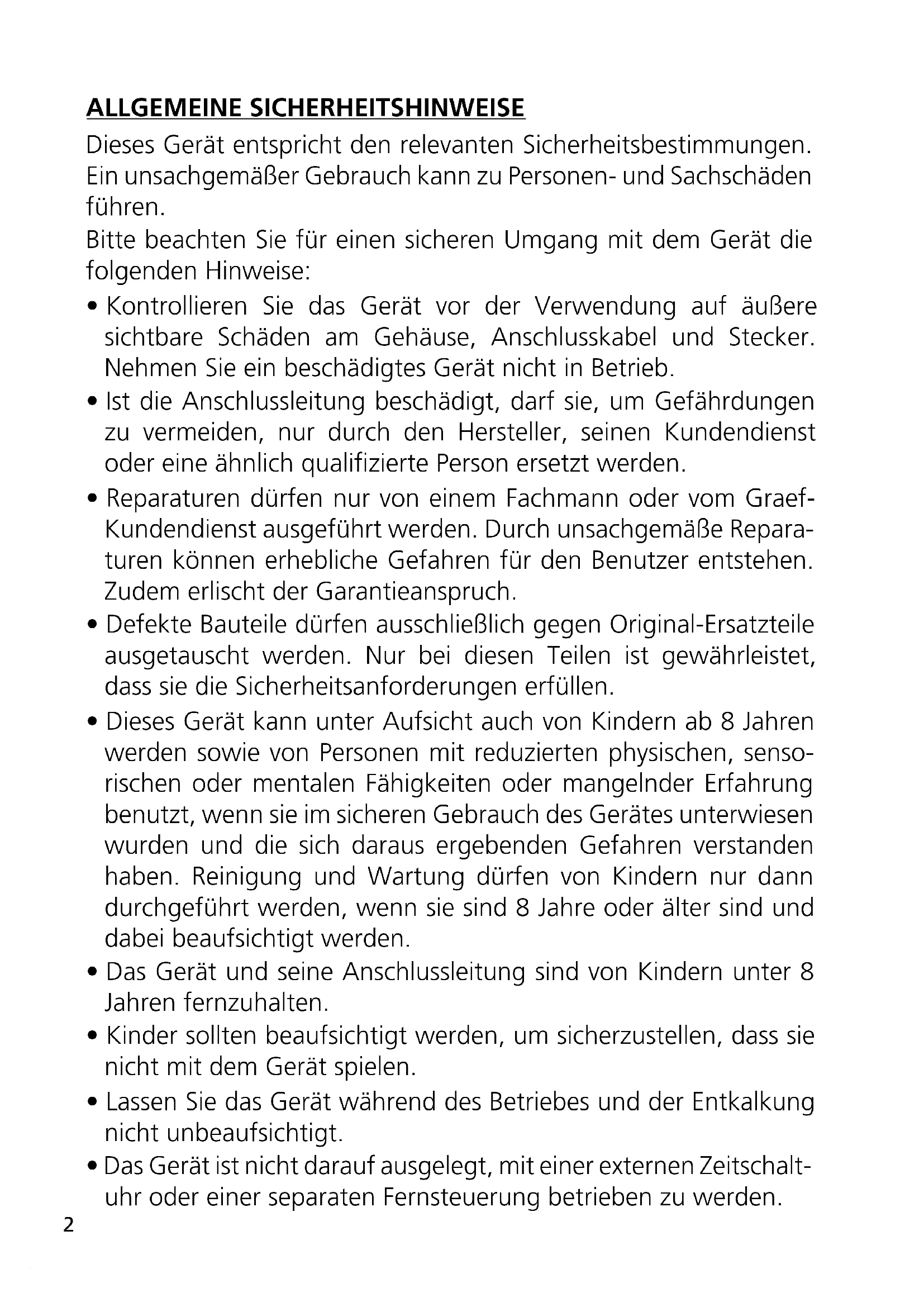 - Reparaturen dürfen nur von einem Fachmann oder vom Graef- Kundendienst ausgeführt werden. Durch unsachgemäße Repara- turen können erhebliche Gefahren für den Benutzer entstehen. Zudem erlischt der Garantieanspruch.