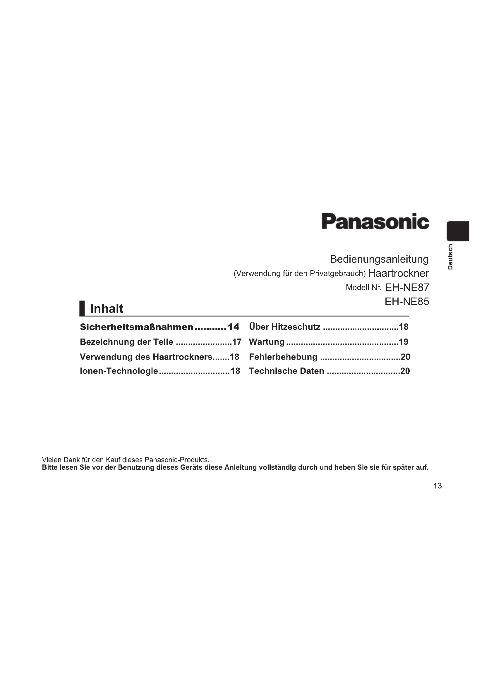 - Figure A Figure B Fuse (10 ampere) Fuse (10 ampere)13 Deutsch Bedienungsanleitung (Verwendung für den Privatgebrauch) Haartrockner Modell Nr. EH-NE87 EH-NE85 Vielen Dank für den Kauf dieses Panasonic-Produkts. Bitte lesen Sie vor der Benutzung dieses Geräts diese Anleitung vollständig durch und heben Sie sie für später auf. Sicherheitsmaßnahmen p. 14