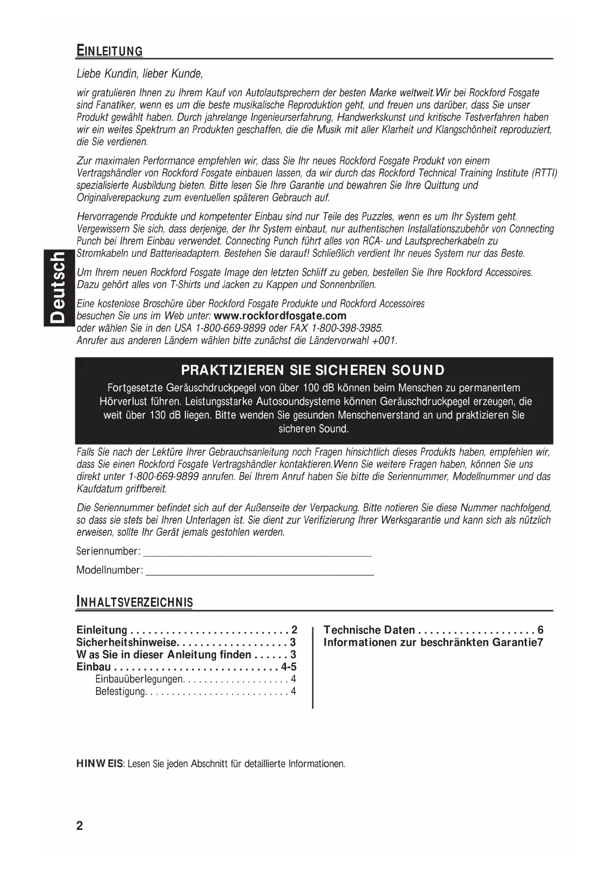 Falls Sie nach der Lekture ihrer Gebrauchsanleitung noch Fragen hinsichtlich thesese Produkte haben, empfehlen wir, dass Sie einen Rockford Fosgate Vertragshandler kontaktieren. Wenn Sie weitere Fragen haben, konnen Sie uns direkt unter 1-800-669-9899 anrufen. Bei Ihr dem Anruf haben Sieitte die Seriennummer, Modellnummer und das Kaufdatum griffbereit.