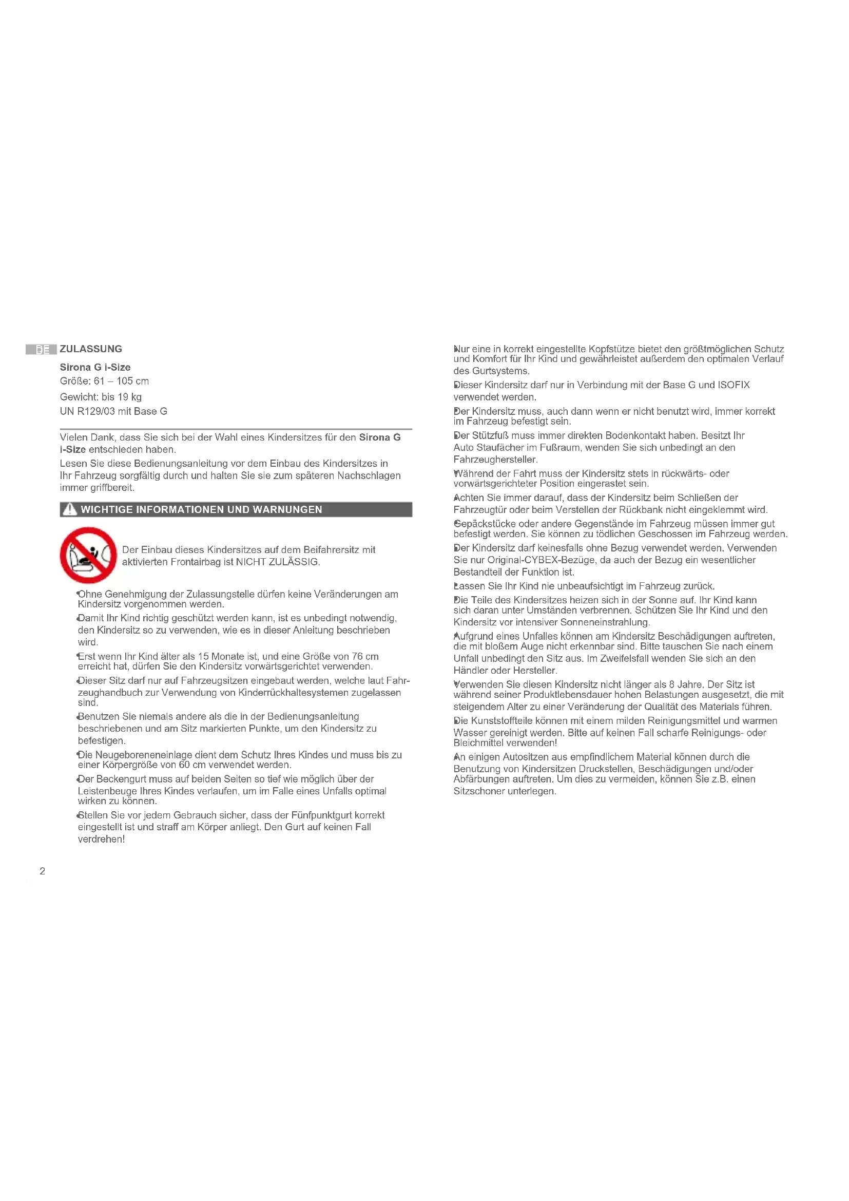 ZULASSUNG Sirona G i-Size Größe: 61 – 105 cm Gewicht: bis 19 kg UN R129/03 mit Base G Vielen Dank, dass Sie sich bei der Wahl eines Kindersitzes für den Sirona G i-Size entschieden haben. Lesen Sie diese Bedienungsanleitung vor dem Einbau des Kindersitzes in Ihr Fahrzeug sorgfältig durch und halten Sie sie zum späteren Nachschlagen immer gribereit.