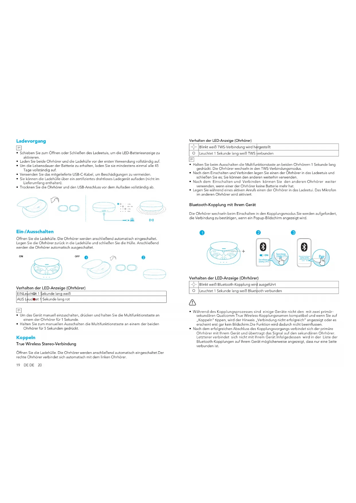 Soundcore Liberty 2 Pro Soundcore Liberty 2 Pro Bluetooth Pairing Request “Headset” would like to pair with your Phone Cancel Pair Pair Verhalten der LED-Anzeige (Ohrhörer) Blinkt weiß Bluetooth-Kopplung wird ausgeführt Leuchtet 1 Sekunde lang weiß Bluetooth verbunden