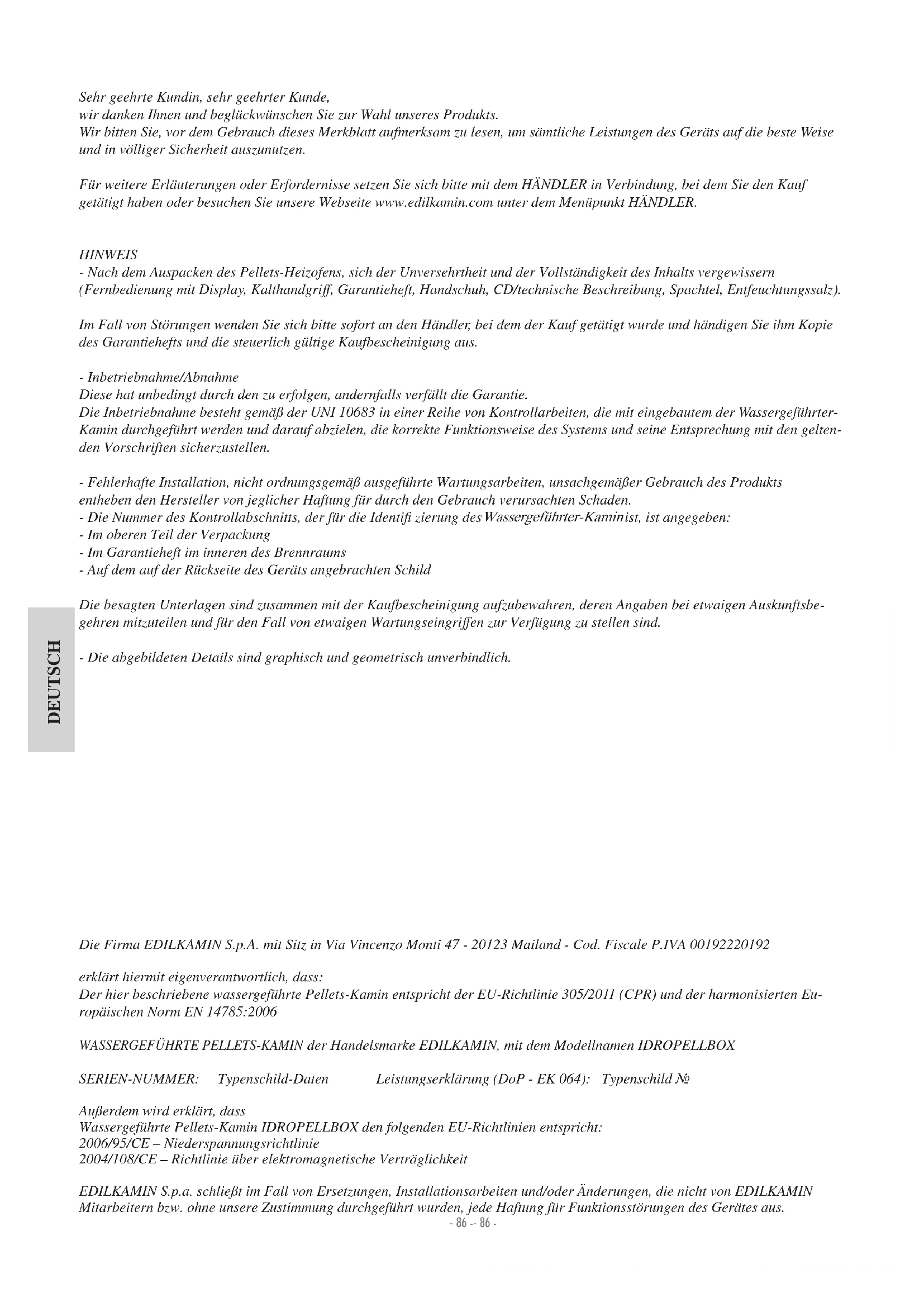 der Handelsmarke EDILKAMIN, mit dem Modellnamen IDROPELLBOX SERIEN-NUMMER: Typenschild-Daten Leistungserklärung (DoP - EK 064): Typenschild Nr. Außerdem wird erklärt, dass Wassergeführte Pellets-Kamin IDROPELLBOX den folgenden EU-Richtlinien entspricht: 2006/95/CE – Niederspannungsrichtlinie 2004/108/CE – Richtlinie über elektromagnetische Verträglichkeit EDILKAMIN S.p.a. schließt im Fall von Ersetzungen, Installationsarbeiten und/oder Änderungen, die nicht von EDILKAMIN Mitarbeitern bzw. ohne unsere Zustimmung durchgeführt wurden, jede Haftung für Funktionsstörungen des Gerätes aus.- 87 -- 87 - DEUTSCH BENUTZERHINWEIS Gemäß Art. 13 der Verordnung Nr. 151 vom 25. Juli 2005 “Durchführung der Richtlinien 2002/95EG und 2002/108 EG, bezüglich der Eindämmung des Gebrauchs von gefährlichen Stoffen in Elektro- und Elektronik-Geräten, sowie bezüglich der Abfallentsorgung”. Das Symbol der durchkreuzten Mülltonne auf dem Gerät oder auf der Verpackung zeigt an, dass das Er- zeugnis nach dessen Nutzungsdauer getrennt von anderem Abfall zu entsorgen ist. Der Benutzer hat daher das Gerät bei dessen Lebensende an die zuständigen Sammelstellen der getrennten Müllabfuhr des Elektro- und Elektronik-Abfalls oder dem Händler zum Zeitpunkt des Erwerbs eines neuen Geräts gleicher Art im Verhältnis von eins zu eins zu übergeben. SICHERHEITSHINWEISE IDROPELLBOX DARF NIEMALS OHNE WASSER IN DER ANLAGE. MUSS MIT EINEM DRUCK VON ETWA 1,5 BAR BETRIE- BEN WERDEN.