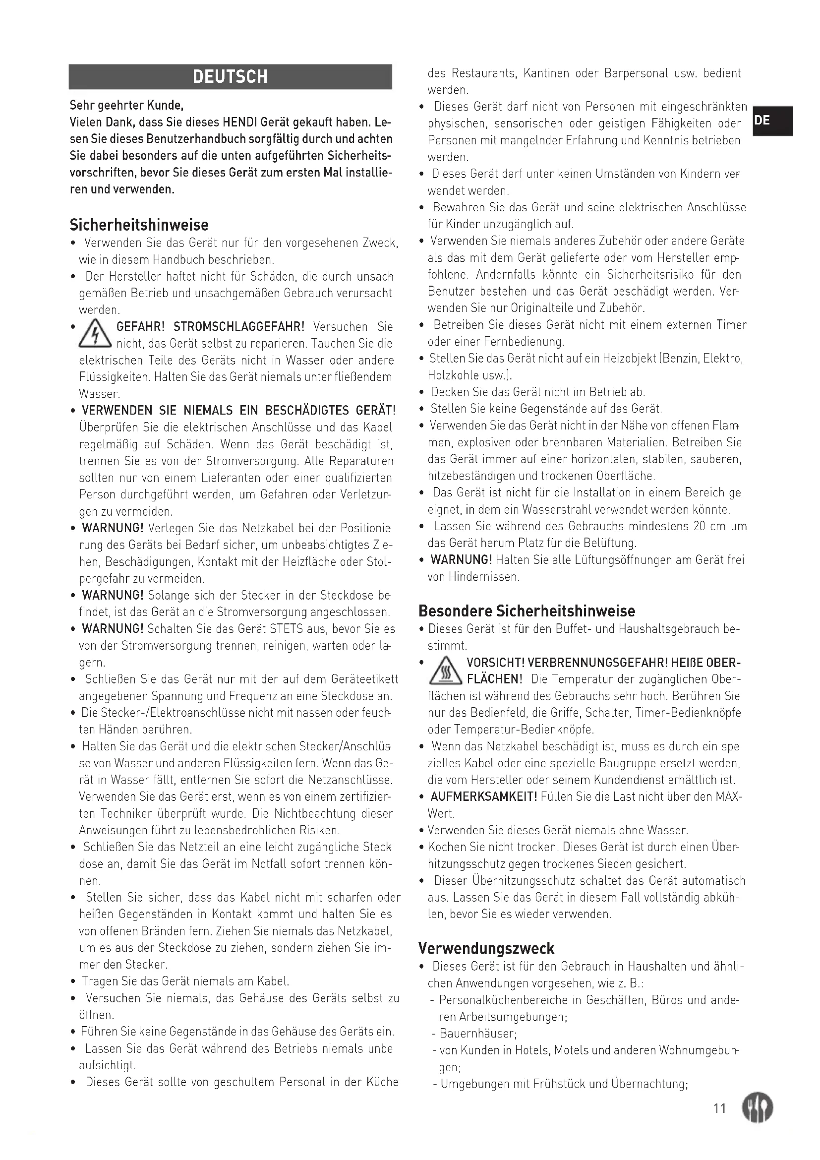 DEUTSCH Sehr geehrter Kunde, Vielen Dank, dass Sie dieses HENDI Gerät gekauft haben. Le