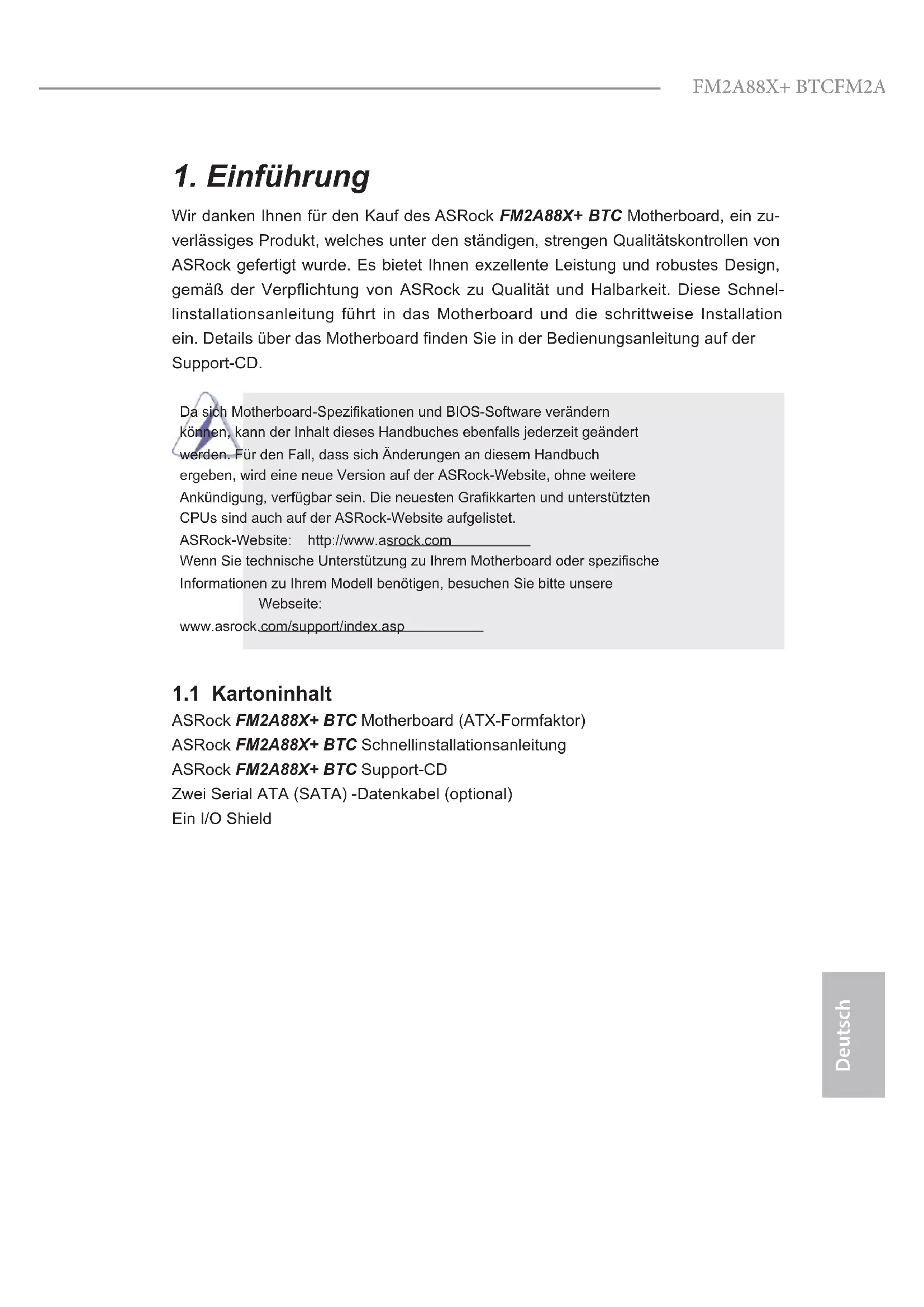 Wir danken Ihnen für den Kauf des ASRock FM2A88X+ BTC Motherboard, ein zu- verlässiges Produkt, welches unter den ständigen, strengen Qualitätskontrollen von ASRock gefertigt wurde. Es bietet Ihnen exzellente Leistung und robustes Design, gemäß der Verpflichtung von ASRock zu Qualität und Halbarkeit. Diese Schnel- linstallationsanleitung führt in das Motherboard und die schrittweise Installation ein. Details über das Motherboard nden Sie in der Bedienungsanleitung auf der Support-CD. Da sich Motherboard-Spezikationen und BIOS-Software verändern können, kann der Inhalt dieses Handbuches ebenfalls jederzeit geändert werden. Für den Fall, dass sich Änderungen an diesem Handbuch ergeben, wird eine neue Version auf der ASRock-Website, ohne weitere Ankündigung, verfügbar sein. Die neuesten Grakkarten und unterstützten CPUs sind auch auf der ASRock-Website aufgelistet. ASRock-Website: http://www.asrock.com Wenn Sie technische Unterstützung zu Ihrem Motherboard oder spezische Informationen zu Ihrem Modell benötigen, besuchen Sie bitte unsere Webseite: www.asrock.com/support/index.asp