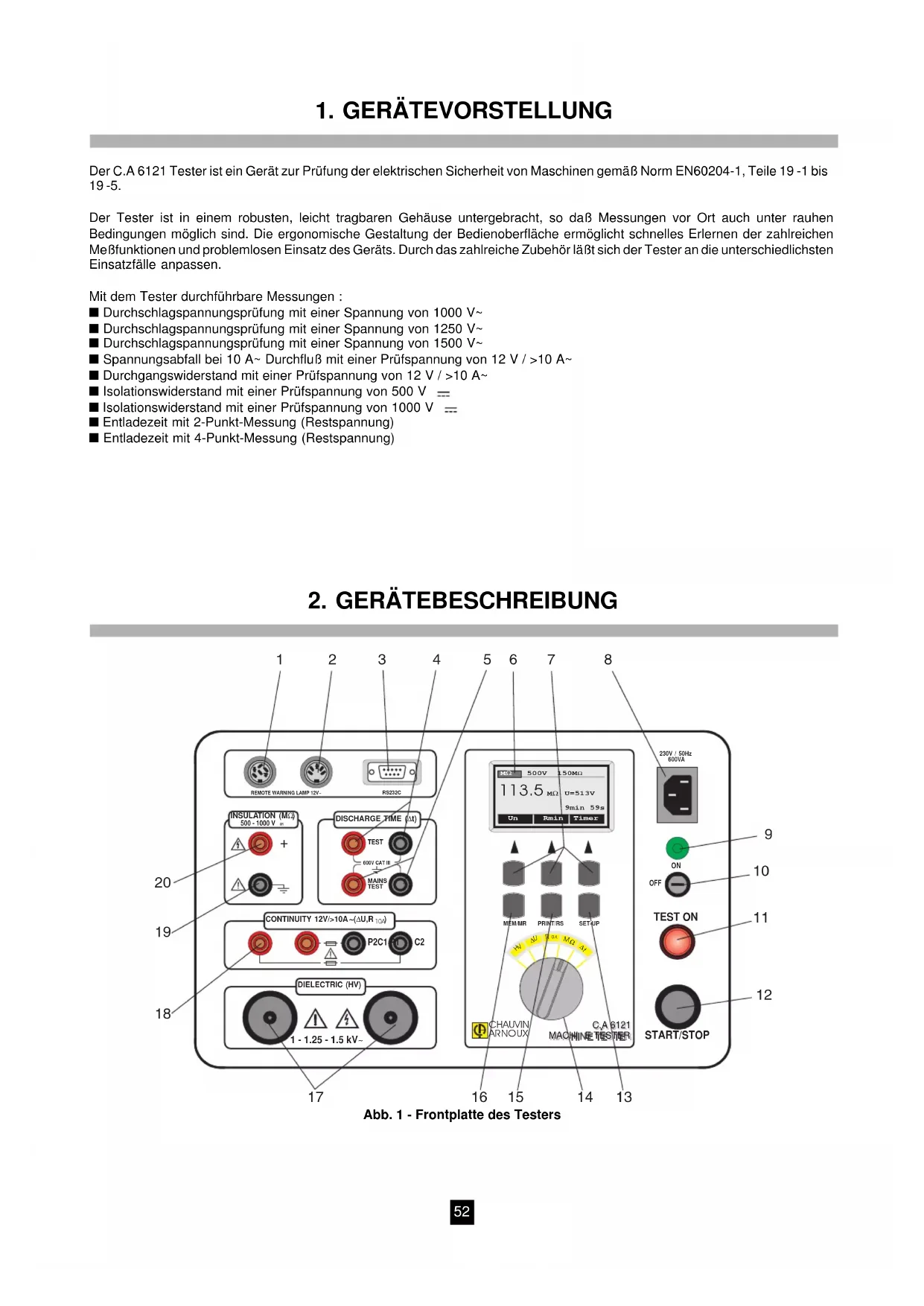 ■ SPARE PARTS 1 rigid bag for accessories ............................................................................................................................................ P01298031 2 dielectric test guns with cable 2 m ............................................................................................................................. P01101919 1 continuity test lead, 2.5 m (red) .................................................................................................................................. P01295140 1 continuity test lead, 2.5 m (black) ............................................................................................................................... P01295137 2 safety leads, 3 m (1 red, 1 black)................................................................................................................................ P01295097 2 test prods (1 red, 1 black) ......................................................................................................................................... P01295458Z 2 crocodile clips (1 red, 1 black) ................................................................................................................................. P01295457Z 1 discharge time cable (EURO) .................................................................................................................................... P01295141 1 discharge time cable (GB) .......................................................................................................................................... P01295142 Cable DB9F-25F x2 ....................................................................................................................................................... P01295172 Cable DB9F-DB9M N°01 .............................................................................................................................................. P01295173 1 adapter DB9F-DB25M ................................................................................................................................................ P01101841 5 rolls of paper for serial printer .................................................................................................................................... P01101842 10 fuses 20 A-600 V, 10.3 x 38F .................................................................................................................................... P01297030 10 fuses 1 A-250 V, 5 x 20T ........................................................................................................................................... P01297031 10 fuses 4 A-250 V, 5 x 20T ........................................................................................................................................... P01297032 10 fuses 0,2 A-250 V, 6.3 x 32F ..................................................................................................................................... P0129703350 Bedeutung des Symbols : ACHTUNG ! Bitte beachten Sie die Hinweise in der Bedienungsanleitung vor Benutzung des Geräts ! Wir bedanken uns bei Ihnen für den Kauf des C.A 6121 MASCHINEN-TESTERS und das damit entgegengebrachte Vertrauen. Um die besten Ergebnisse mit dem Maschinen-Tester zu erhalten, bitten wir Sie : ■ die vorliegende Bedienungsanleitung sorgfältig zu lesen, da die Benutzung des Testers sonst für den Bediener, für das Gerät selbst oder für die zu prüfende Schaltung eine Gefahr darstellen kann! ■ die in der Anleitung enthaltenen Sicherheitshinweise zu beachten. SICHERHEITSHINWEISE ■ Der Tester darf nur an Steckdosen mit Schutzerde-Kontakt angeschlossen werden (SCHUKO-Dose). ■ Die Anschlußbuchsen für Spannungs- (DIELECTRIC), Durchgangs- (CONTINUITY) und Isolationsprüfung (INSULATION) dürfen nur an spannungsfreie Schaltungen angeschlossen werden. ■ Durchgebrannte Sicherungen im Tester immer genau nach Angaben in der vorliegenden Anleitung ersetzen. ■ Wartungs- oder Nachkalibrierarbeiten sind ausschließlich von qualifiziertem Fachpersonal vorzunehmen. ■ Der C.A 6121 MASCHINEN-TESTER darf nur von Fachkräften benutzt werden, die mit den Gefahren elektrischer Hochspannung vertraut sind. ■ Isolationsprüfung Diese Buchse ist geerdet, sie muß an den geerdeten Pol des Prüflings angeschlossen werden. ■ Durchgangsprüfung Bitte Hinweise zum Ersetzen der Sicherung beachten. ■ Spannungsprüfung Schalten Sie den Tester sofort aus, falls die rote Lampe (Pos. 11, Abb. 1) nach Einschalten des Hochspannungsgenerators nicht aufleuchtet und lassen Sie den Tester vom Kundendienst überprüfen. ■ Bedeutung der Symbole : ACHTUNG! An diesen Buchsen können gefährliche Hochspannungen anliegen ! Erd-Klemme Der Netzanschluß des TESTERS erfüllt die Anforderungen der Überspannungskategorie II. Er ist an fest eingebaute elektrische Anlagen, an Hausinstallationen oder gleichwertige Netze anzuschließen (vgl. IEC 664-1). Die Eingangsbuchsen für Entladezeit-Messung (DISCHARGE TIME) entsprechen der Überspannungskategorie III. Sie erfüllen damit die hohen Anforderungen an Zuverlässigkeit und Verfügbarkeit die für ständige Benutzung an fest eingebauten industriellen Elektroanlagen zu stellen sind (vgl. IEC 664-1).51 GARANTIEBEDINGUNGEN Für den Tester gewähren wir eine Garantie von 12 Monaten ab dem Datum der Bereitstellung des Geräts. (Auszug aus unseren allgemeinen Geschäftsbedingungen, die auf Anfrage erhältlich sind). INHALT 1. GERÄTEVORSTELLUNG ..................................................................................................................................................... 52 2. GERÄTEBESCHREIBUNG................................................................................................................................................... 52 3. TECHNISCHE DATEN ..............................................................................................................