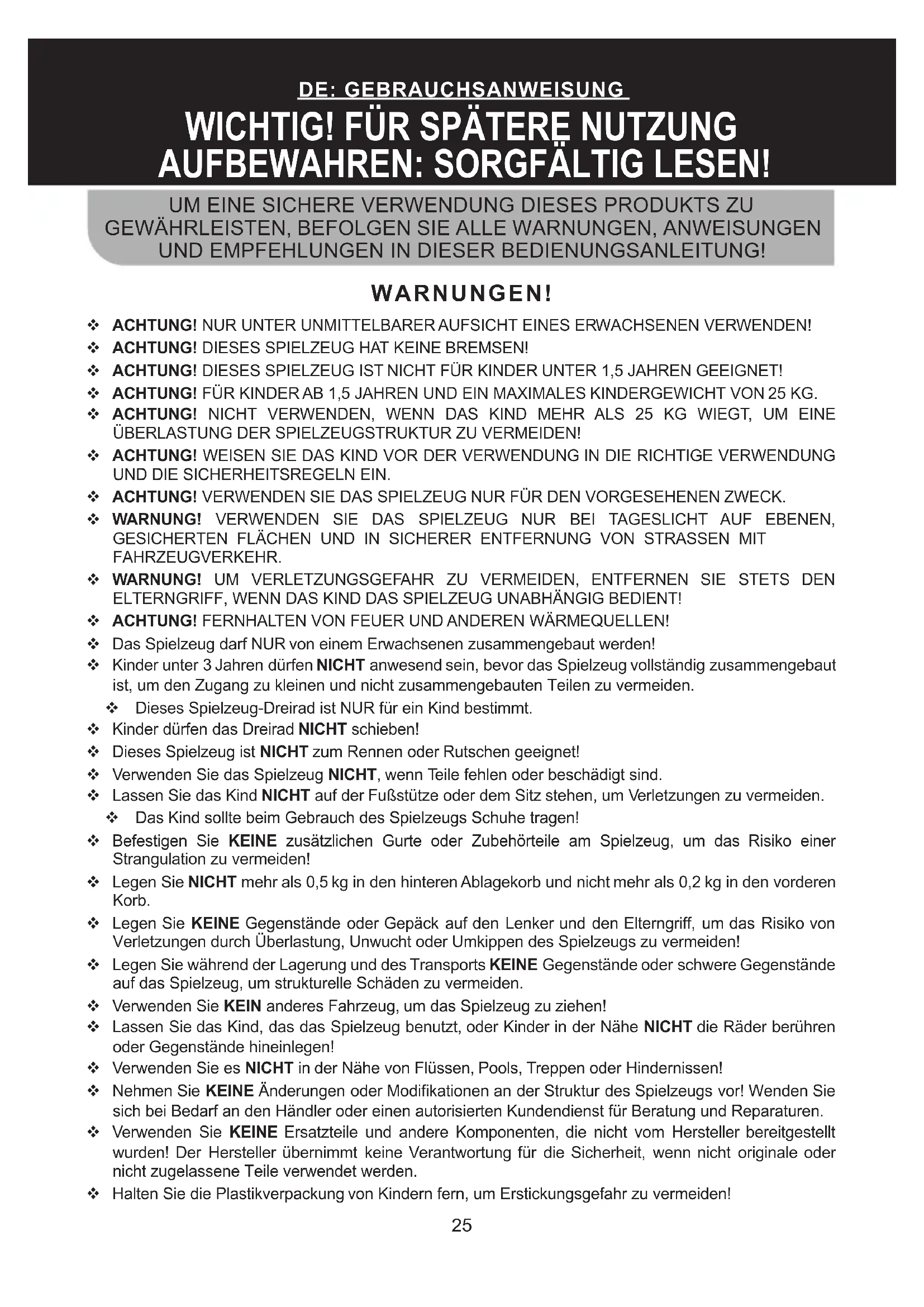 AUFBEWAHREN: SORGFÄLTIG LESEN! WARNUNGEN! ACHTUNG! NUR UNTER UNMITTELBARER AUFSICHT EINES ERWACHSENEN VERWENDEN! ACHTUNG! DIESES SPIELZEUG HAT KEINE BREMSEN! ACHTUNG! DIESES SPIELZEUG IST NICHT FÜR KINDER UNTER 1,5 JAHREN GEEIGNET! ACHTUNG! FÜR KINDER AB 1,5 JAHREN UND EIN MAXIMALES KINDERGEWICHT VON 25 KG. ACHTUNG! NICHT VERWENDEN, WENN DAS KIND MEHR ALS 25 KG WIEGT, UM EINE ÜBERLASTUNG DER SPIELZEUGSTRUKTUR ZU VERMEIDEN! ACHTUNG! WEISEN SIE DAS KIND VOR DER VERWENDUNG IN DIE RICHTIGE VERWENDUNG UND DIE SICHERHEITSREGELN EIN. ACHTUNG! VERWENDEN SIE DAS SPIELZEUG NUR FÜR DEN VORGESEHENEN ZWECK. WARNUNG! VERWENDEN SIE DAS SPIELZEUG NUR BEI TAGESLICHT AUF EBENEN, GESICHERTEN FLÄCHEN UND IN SICHERER ENTFERNUNG VON STRASSEN MIT FAHRZEUGVERKEHR. WARNUNG! UM VERLETZUNGSGEFAHR ZU VERMEIDEN, ENTFERNEN SIE STETS DEN ELTERNGRIFF, WENN DAS KIND DAS SPIELZEUG UNABHÄNGIG BEDIENT! ACHTUNG! FERNHALTEN VON FEUER UND ANDEREN WÄRMEQUELLEN! Das Spielzeug darf NUR von einem Erwachsenen zusammengebaut werden! Kinder unter 3 Jahren dürfen NICHT anwesend sein, bevor das Spielzeug vollständig zusammengebaut ist, um den Zugang zu kleinen und nicht zusammengebauten Teilen zu vermeiden. Dieses Spielzeug-Dreirad ist NUR für ein Kind bestimmt. Kinder dürfen das Dreirad NICHT schieben! Dieses Spielzeug ist NICHT zum Rennen oder Rutschen geeignet! Verwenden Sie das Spielzeug NICHT, wenn Teile fehlen oder beschädigt sind. Lassen Sie das Kind NICHT auf der Fußstütze oder dem Sitz stehen, um Verletzungen zu vermeiden. Das Kind sollte beim Gebrauch des Spielzeugs Schuhe tragen! Befestigen Sie KEINE zusätzlichen Gurte oder Zubehörteile am Spielzeug, um das Risiko einer Strangulation zu vermeiden! Legen Sie NICHT mehr als 0,5 kg in den hinteren Ablagekorb und nicht mehr als 0,2 kg in den vorderen Korb. Legen Sie KEINE Gegenstände oder Gepäck auf den Lenker und den Elterngri, um das Risiko von Verletzungen durch Überlastung, Unwucht oder Umkippen des Spielzeugs zu vermeiden! Legen Sie während der Lagerung und des Transports KEINE Gegenstände oder schwere Gegenstände auf das Spielzeug, um strukturelle Schäden zu vermeiden. Verwenden Sie KEIN anderes Fahrzeug, um das Spielzeug zu ziehen! Lassen Sie das Kind, das das Spielzeug benutzt, oder Kinder in der Nähe NICHT die Räder berühren oder Gegenstände hineinlegen! Verwenden Sie es NICHT in der Nähe von Flüssen, Pools, Treppen oder Hindernissen! Nehmen Sie KEINE Änderungen oder Modikationen an der Struktur des Spielzeugs vor! Wenden Sie sich bei Bedarf an den Händler oder einen autorisierten Kundendienst für Beratung und Reparaturen. Verwenden Sie KEINE Ersatzteile und andere Komponenten, die nicht vom Hersteller bereitgestellt wurden! Der Hersteller übernimmt keine Verantwortung für die Sicherheit, wenn nicht originale oder nicht zugelassene Teile verwendet werden. Halten Sie die Plastikverpackung von Kindern fern, um Erstickungsgefahr zu vermeiden!