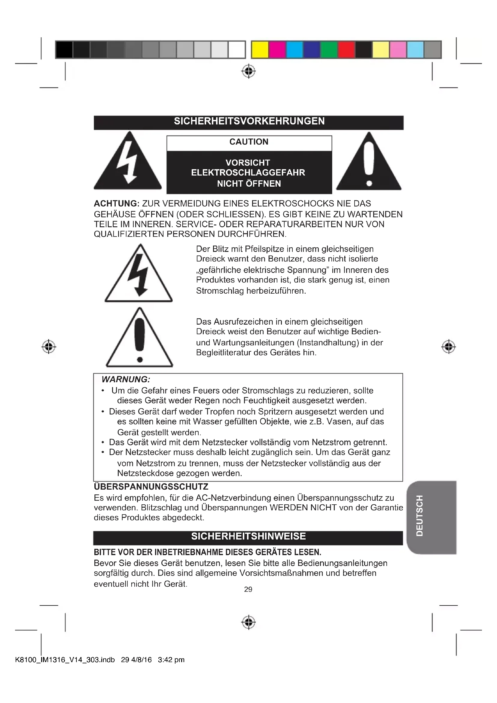 ÜBERSPANNUNGSSCHUTZ Es wird empfohlen, für die AC-Netzverbindung einen Überspannungsschutz zu verwenden. Blitzschlag und Überspannungen WERDEN NICHT von der Garantie dieses Produktes abgedeckt. BITTE VOR DER INBETRIEBNAHME DIESES GERÄTES LESEN. Bevor Sie dieses Gerät benutzen, lesen Sie bitte alle Bedienungsanleitungen sorgfältig durch. Dies sind allgemeine Vorsichtsmaßnahmen und betreffen eventuell nicht Ihr Gerät. SICHERHEITSHINWEISE K8100_IM1316_V14_303.indb 29 4/8/16 3:42 pm30
