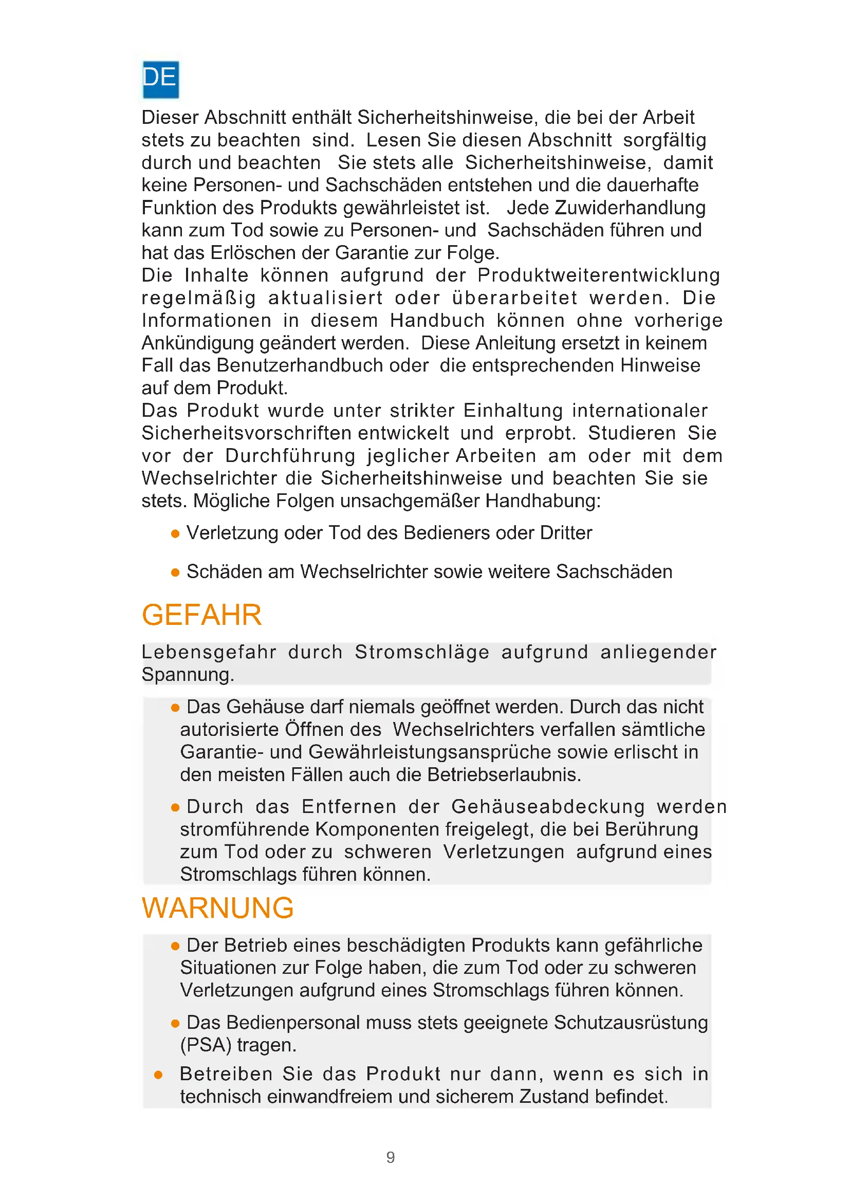 Das Produkt wurde unter strikter Einhaltung internationaler Sicherheitsvorschriften entwickelt und erprobt. Studieren Sie vor der Durchführung jeglicher Arbeiten am oder mit dem Wechselrichter die Sicherheitshinweise und beachten Sie sie stets. Mögliche Folgen unsachgemäßer Handhabung: