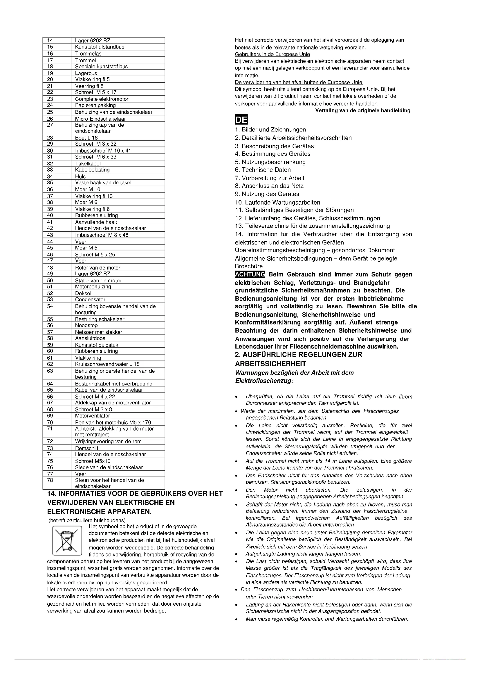 ARBEITSSICHERHEIT Warnungen bezüglich der Arbeit mit dem Elektroflaschenzug: Überprüfen, ob die Leine auf die Trommel richtig mit dem ihrem Durchmesser entsprechenden Takt aufgerollt ist. Werte der maximalen, auf dem Datenschild des Flaschenzuges angegebenen Belastung beachten. Die Leine nicht vollständig ausrollen. Restleine, die für zwei Umwicklungen der Trommel reicht, auf der Trommel eingewickelt lassen. Sonst könnte sich die Leine in entgegengesetzte Richtung aufwickeln, die Steuerungsknöpfe würden umgepolt und der Endausschalter würde seine Rolle nicht erfüllen. Auf die Trommel nicht mehr als 14 m Leine aufspulen. Eine größere Menge der Leine könnte von der Trommel abrutschen. Den Endschalter nicht für das Anhalten des Vorschubes nach oben benutzen. Steuerungsdruckknöpfe benutzen. Den Motor nicht überlasten. Die zulässigen, in der Bedienungsanleitung anagegebenen Arbeitsbedingungen beachten. Schafft der Motor nicht, die Ladung nach oben zu hieven, muss man Belastung reduzieren. Immer den Zustand der Flaschenzugsleine kontrollieren. Bei irgendwelchen Auffälligkeiten bezüglich des Abnutzungszustandes die Arbeit unterbrechen. Die Leine gegen eine neue unter Beibehaltung derselben Parameter wie die Originalleine bezüglich der Beständigkeit auswechseln. Bei Zweifeln sich mit dem Service in Verbindung setzen. Aufgehängte Ladung nicht länger hängen lassen. Die Last nicht befestigen, sobald Verdacht geschöpft wird, dass ihre Masse größer ist als die Tragfähigkeit des jeweiligen Modells des Flaschenzuges. Der Flaschenzug ist nicht zum Verbringen der Ladung in eine andere als vertikale Richtung zu benutzen. Den Flaschenzug zum Hochheben/Herunterlassen von Menschen oder Tieren nicht verwenden. Ladung an der Hakenkante nicht befestigen oder dann, wenn sich die Sicherheitsratsche nicht in der Ausgangsposition befindet. Man muss regelmäßig Kontrollen und Wartungsarbeiten durchführen. Die Leine mit der Last in vertikaler Position halten, nicht zulassen, dass sie sich windet oder verwirrt. Mit der aufgehängten Ladung nicht schwingen. Unter der aufgehängten Ladung nicht durchgehen und keine Arbeiten ausführen. Do hochgehobene Ladung nicht ohne Aufsicht lassen. Den Flaschenzug nicht benutzen, wenn die Gefahr besteht, dass sich Kinder oder unbefugte Dritte in seinen Arbeitsbereich hineindringen können. Vor der Befestigung des Flaschenzuges muss man sich vergewissern, dass die Tragkonstruktion so entworfen ist, dass sie in der Lage ist, eine gleiche Last zu halten (maximale Tragkraft des Flaschenzuges + Gewicht des Flaschenzuges), ohne dass sie beschädigt wird. Für die ordnungsgemäße und sichere Montage haftet der Benutzer. Manuelle Steuerung muss sich außerhalb der Gefährdungszone befinden. Der Kontroll-Steuerungsposten ist so zu lokalisieren, dass der Bediener in der Lage ist, den Arbeitsbereich und die Gefährdungszone zu beobachten.