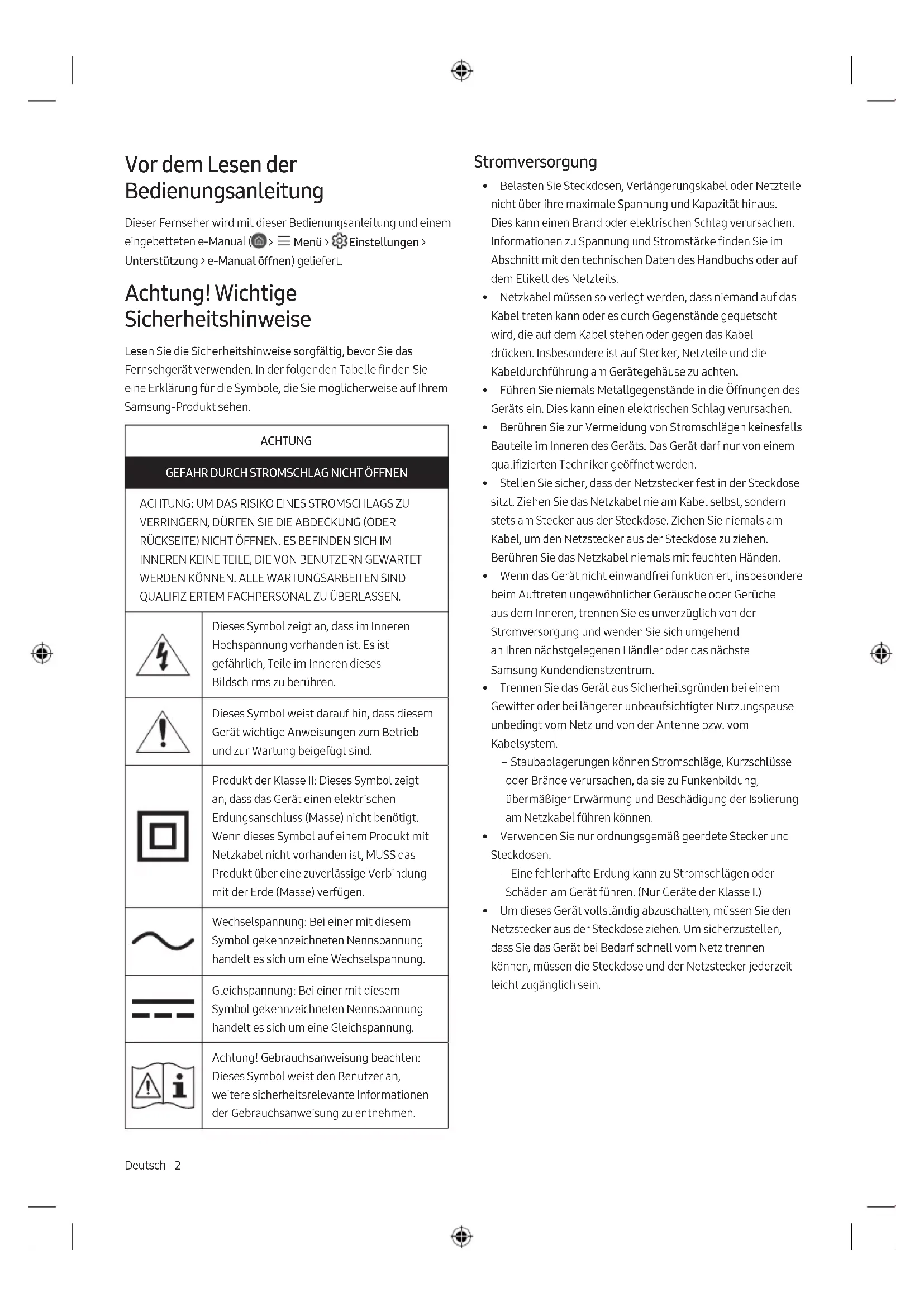 - O tipo de pilha pode variar consoante o modelo. Português - 9 PortuguêsVor dem Lesen der Bedienungsanleitung Dieser Fernseher wird mit dieser Bedienungsanleitung und einem eingebetteten e-Manual ( > Menü > Einstellungen > Unterstützung > e-Manual öffnen) geliefert. Achtung! Wichtige Sicherheitshinweise Lesen Sie die Sicherheitshinweise sorgfältig, bevor Sie das Fernsehgerät verwenden. In der folgenden Tabelle finden Sie eine Erklärung für die Symbole, die Sie möglicherweise auf Ihrem Samsung-Produkt sehen. ACHTUNG