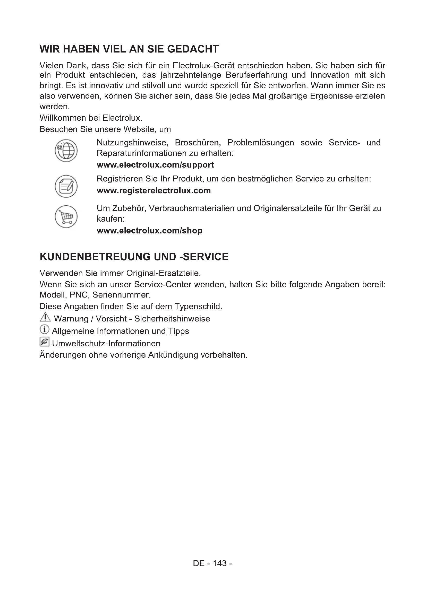 Vielen Dank, dass Sie sich für ein Electrolux-Gerät entschieden haben. Sie haben sich für ein Produkt entschieden, das jahrzehntelange Berufserfahrung und Innovation mit sich bringt. Es ist innovativ und stilvoll und wurde speziell für Sie entworfen. Wann immer Sie es also verwenden, können Sie sicher sein, dass Sie jedes Mal großartige Ergebnisse erzielen werden. Willkommen bei Electrolux. Besuchen Sie unsere Website, um Nutzungshinweise, Broschüren, Problemlösungen sowie Service- und Reparaturinformationen zu erhalten: www.electrolux.com/support Registrieren Sie Ihr Produkt, um den bestmöglichen Service zu erhalten: www.registerelectrolux.com Um Zubehör, Verbrauchsmaterialien und Originalersatzteile für Ihr Gerät zu kaufen: www.electrolux.com/shop