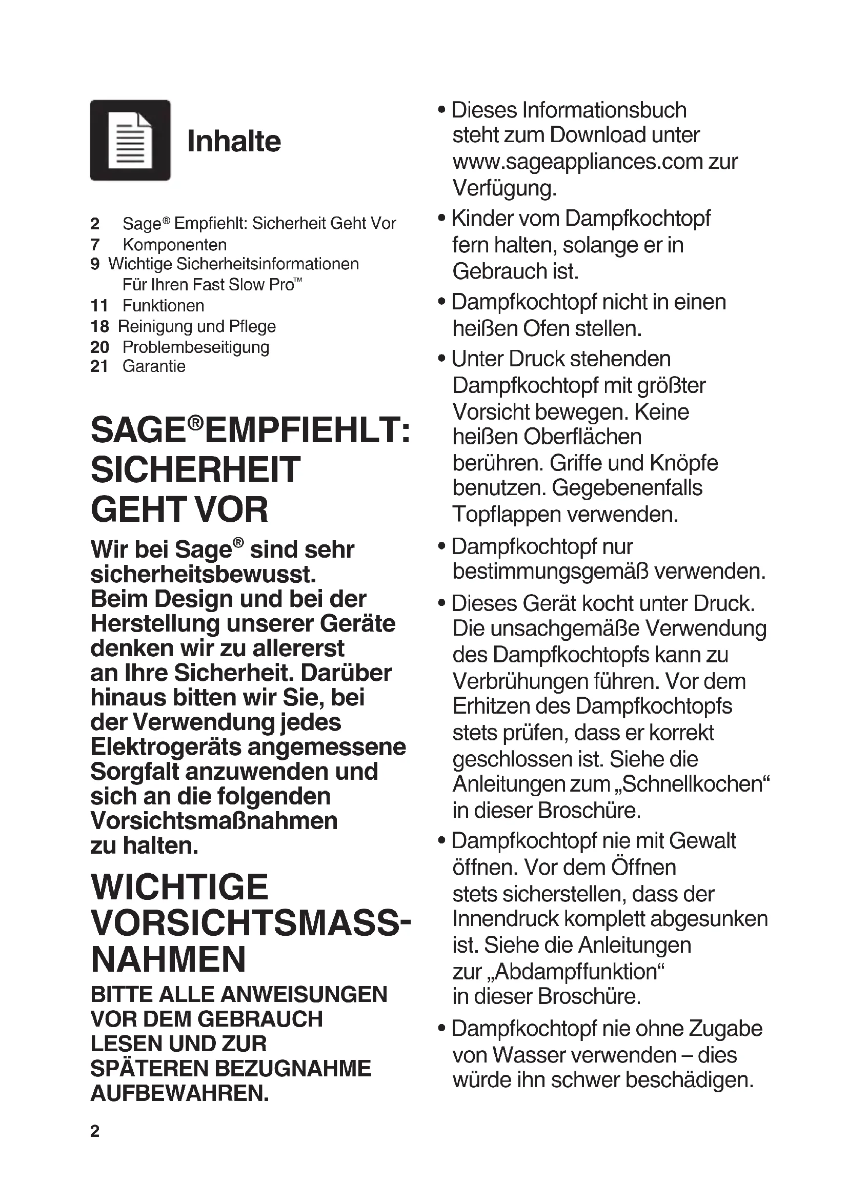 - Dieses Informationsbuch steht zum Download unter www.sageappliances.com zur Verfügung.