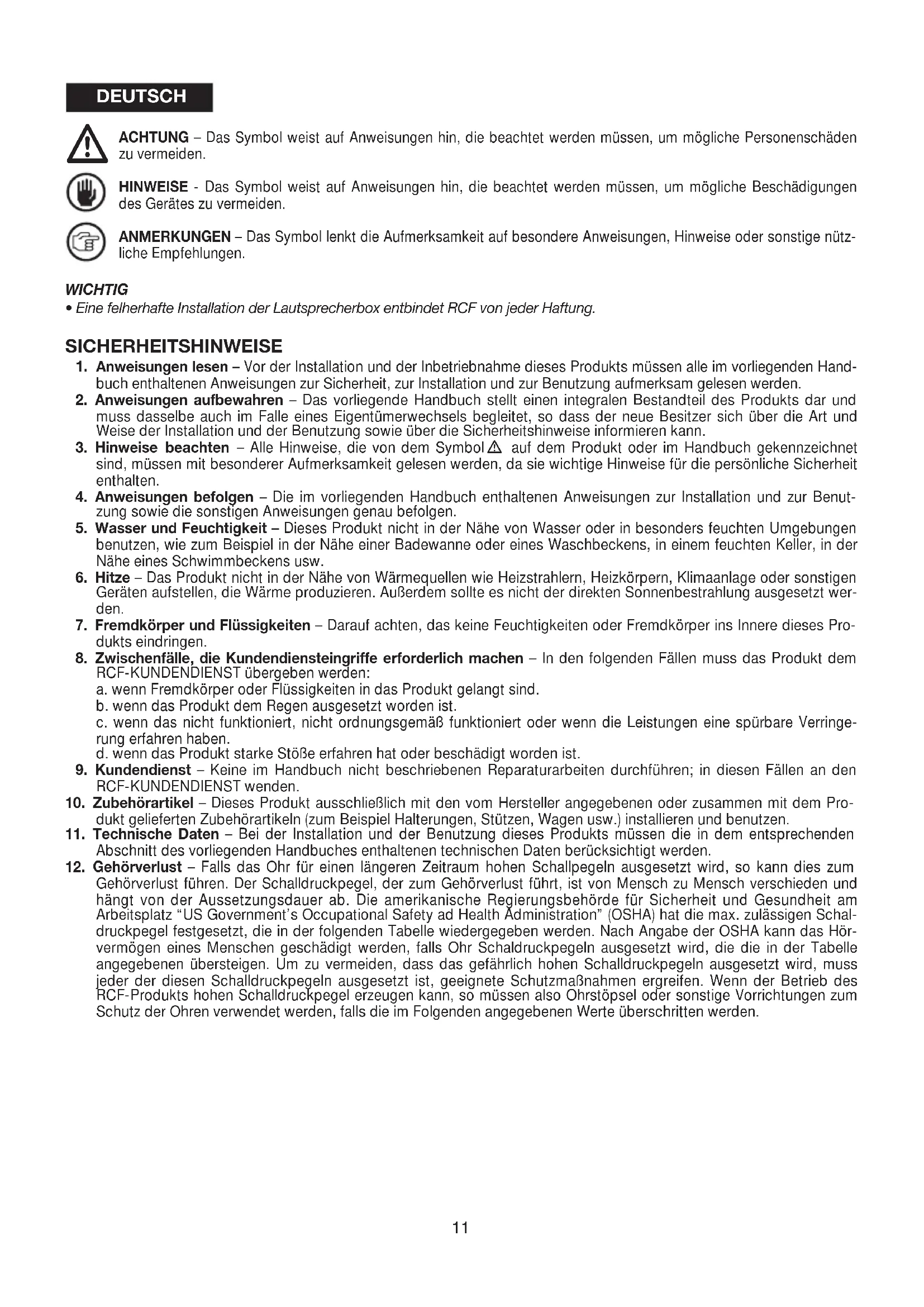 - Eine felherhafte Installation der Lautsprecherbox entbindet RCF von jeder Haftung.