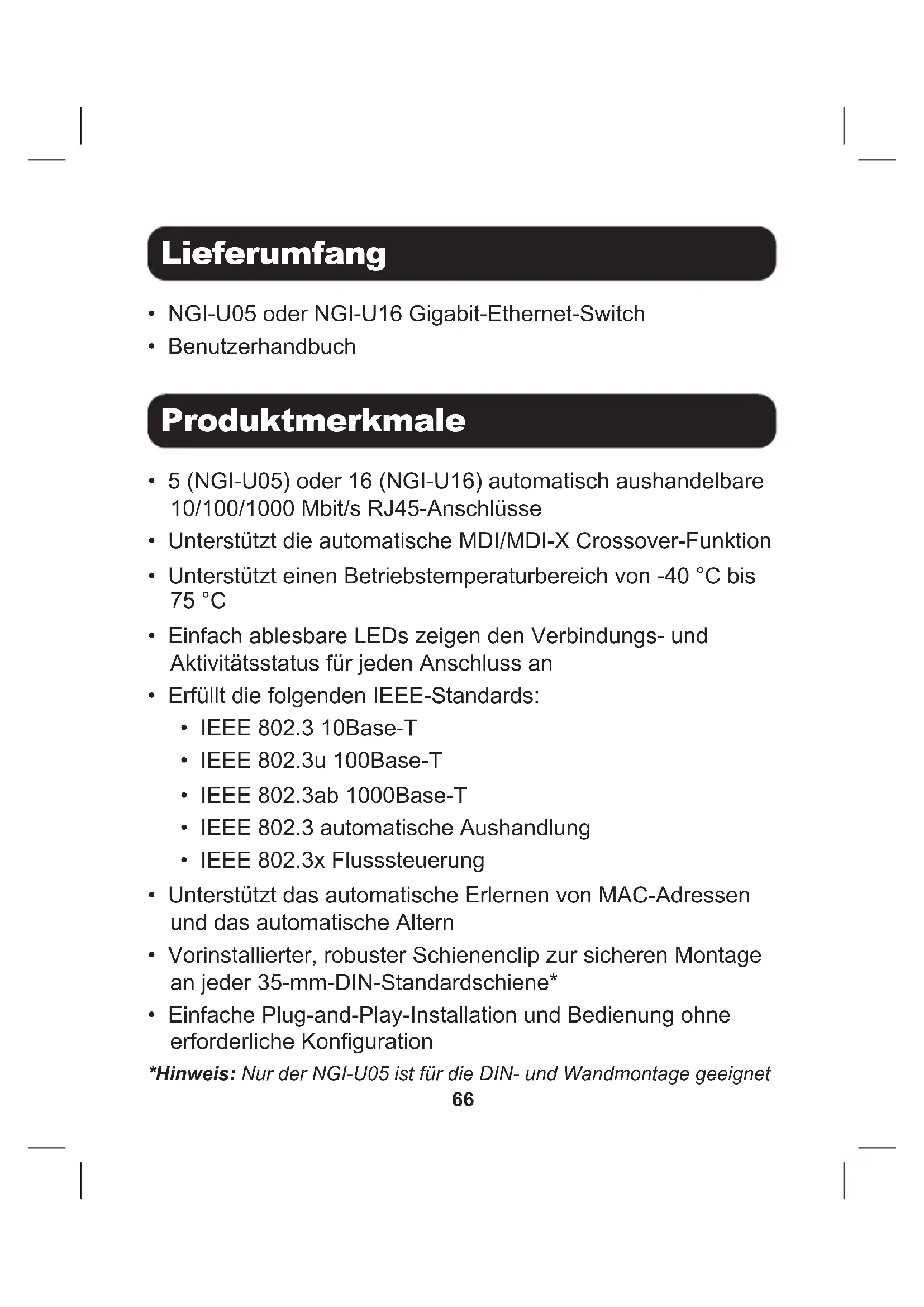 - 5 (NGI-U05) oder 16 (NGI-U16) automatisch aushandelbare 10/100/1000 Mbit/s RJ45-Anschlüsse