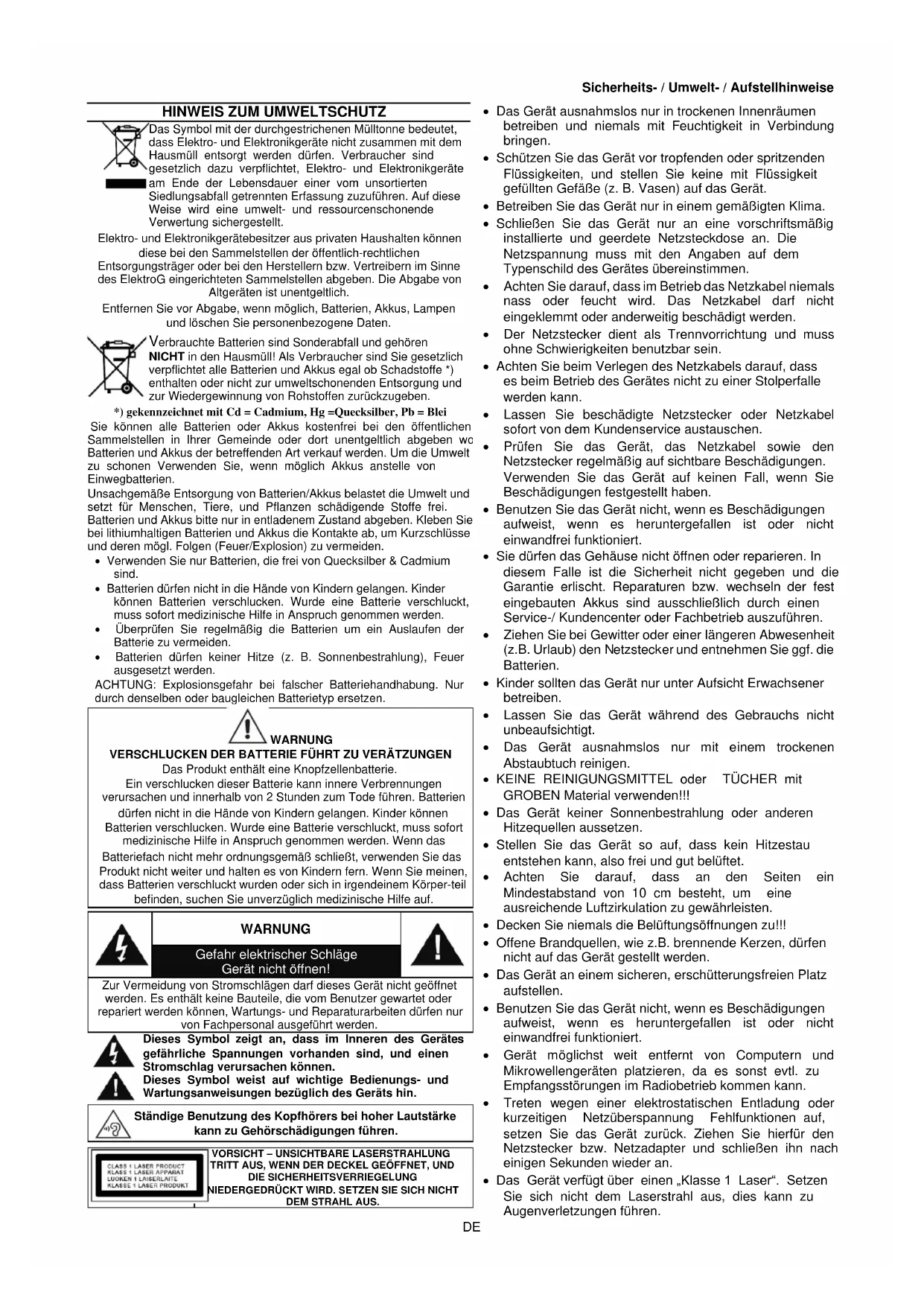 Benützen Sie die Kopfhörer nicht über lange Zeit mit hoher Lautstärke. Dies kann zu nicht reversiblen Hörschädigungen führen.PDB1850 / Deutsche Bedienungsanleitung
