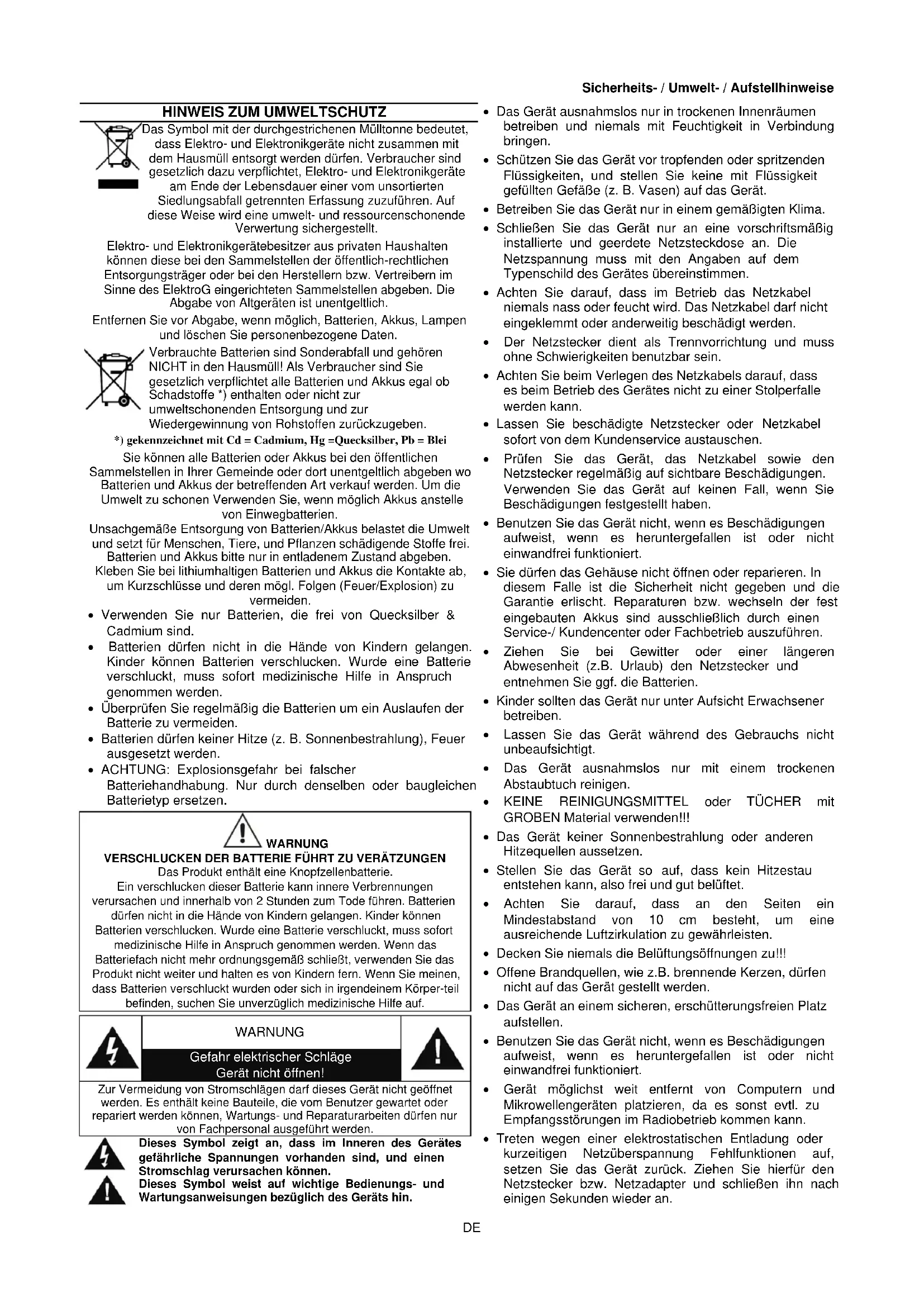 Verbrauchte Batterien sind Sonderabfall und gehören NICHT in den Hausmüll! Als Verbraucher sind Sie gesetzlich verpflichtet alle Batterien und Akkus egal ob Schadstoffe *) enthalten oder nicht zur umweltschonenden Entsorgung und zur Wiedergewinnung von Rohstoffen zurückzugeben. *) gekennzeichnet mit Cd = Cadmium, Hg =Quecksilber, Pb = Blei Sie können alle Batterien oder Akkus bei den öffentlichen Sammelstellen in Ihrer Gemeinde oder dort unentgeltlich abgeben wo Batterien und Akkus der betreffenden Art verkauf werden. Um die Umwelt zu schonen Verwenden Sie, wenn möglich Akkus anstelle von Einwegbatterien. Unsachgemäße Entsorgung von Batterien/Akkus belastet die Umwelt und setzt für Menschen, Tiere, und Pflanzen schädigende Stoffe frei. Batterien und Akkus bitte nur in entladenem Zustand abgeben. Kleben Sie bei lithiumhaltigen Batterien und Akkus die Kontakte ab, um Kurzschlüsse und deren mögl. Folgen (Feuer/Explosion) zu vermeiden.