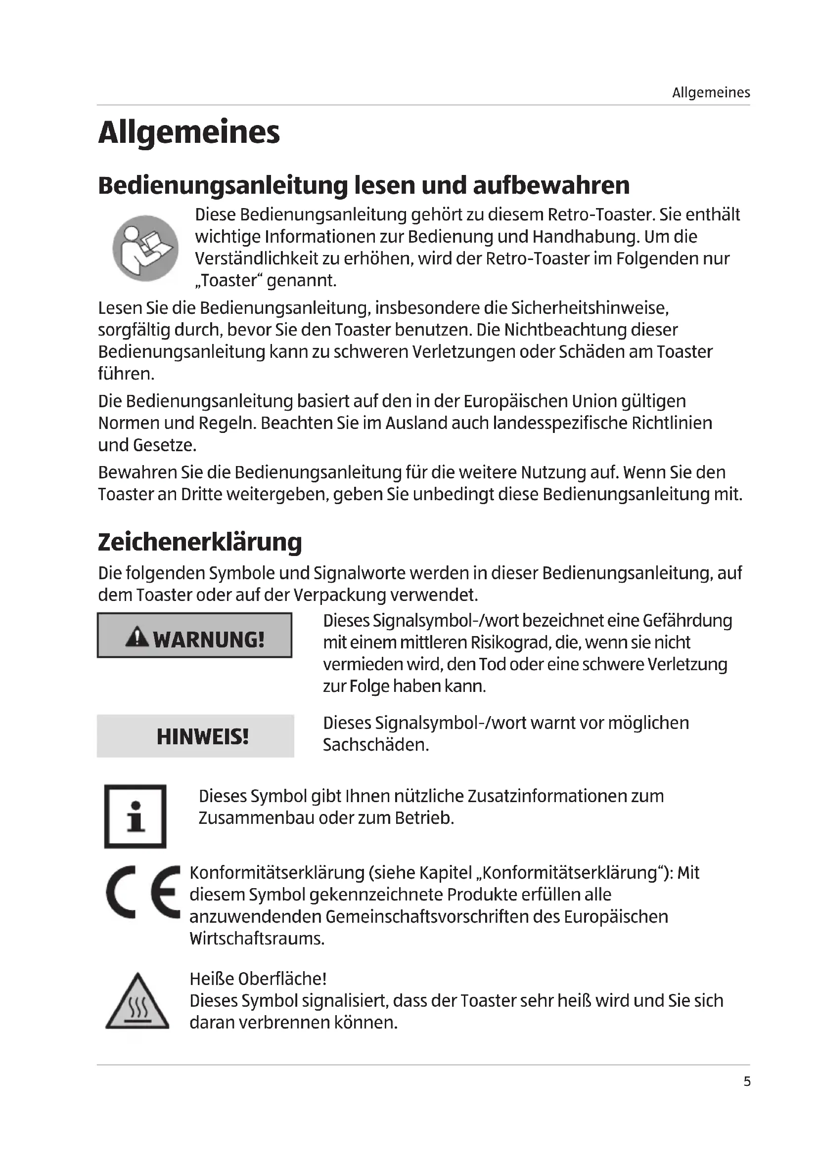 Allgemeines Bedienungsanleitung lesen und aufbewahren Diese Bedienungsanleitung gehört zu diesem Retro-Toaster. Sie enthält wichtige Informationen zur Bedienung und Handhabung. Um die Verständlichkeit zu erhöhen, wird der Retro-Toaster im Folgenden nur „Toaster“ genannt. Lesen Sie die Bedienungsanleitung, insbesondere die Sicherheitshinweise, sorgfältig durch, bevor Sie den Toaster benutzen. Die Nichtbeachtung dieser Bedienungsanleitung kann zu schweren Verletzungen oder Schäden am Toaster führen. Die Bedienungsanleitung basiert auf den in der Europäischen Union gültigen Normen und Regeln. Beachten Sie im Ausland auch landesspezifische Richtlinien und Gesetze. Bewahren Sie die Bedienungsanleitung für die weitere Nutzung auf. Wenn Sie den Toaster an Dritte weitergeben, geben Sie unbedingt diese Bedienungsanleitung mit. Zeichenerklärung Die folgenden Symbole und Signalworte werden in dieser Bedienungsanleitung, auf dem Toaster oder auf der Verpackung verwendet. WARNUNG! Dieses Signalsymbol-/wort bezeichnet eine Gefährdung mit einem mittleren Risikograd, die, wenn sie nicht vermieden wird, den Tod oder eine schwere Verletzung zur Folge haben kann. HINWEIS! Dieses Signalsymbol-/wort warnt vor möglichen Sachschäden. Dieses Symbol gibt Ihnen nützliche Zusatzinformationen zum Zusammenbau oder zum Betrieb. Konformitätserklärung (siehe Kapitel „Konformitätserklärung“): Mit diesem Symbol gekennzeichnete Produkte erfüllen alle anzuwendenden Gemeinschaftsvorschriften des Europäischen Wirtschaftsraums. Heiße Oberfläche! Dieses Symbol signalisiert, dass der Toaster sehr heiß wird und Sie sich daran verbrennen können.Sicherheit