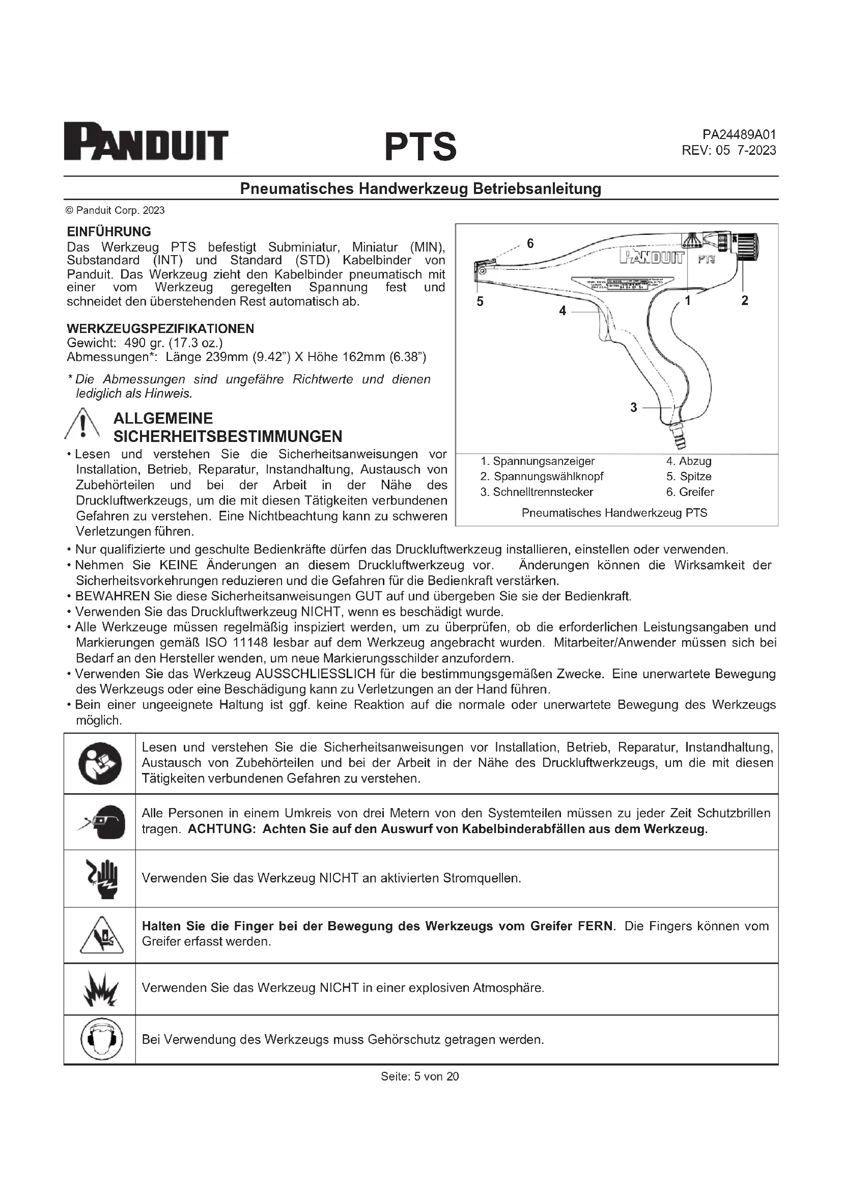 Pneumatisches Handwerkzeug Betriebsanleitung PA24489A01 REV: 05 7-2023 Das Werkzeug PTS befestigt Subminiatur, Miniatur (MIN), Substandard (INT) und Standard (STD) Kabelbinder von Panduit. Das Werkzeug zieht den Kabelbinder pneumatisch mit einer vom Werkzeug geregelten Spannung fest und schneidet den überstehenden Rest automatisch ab. WERKZEUGSPEZIFIKATIONEN Gewicht: 490 gr. (17.3 oz.) Abmessungen*: Länge 239mm (9.42”) X Höhe 162mm (6.38”)