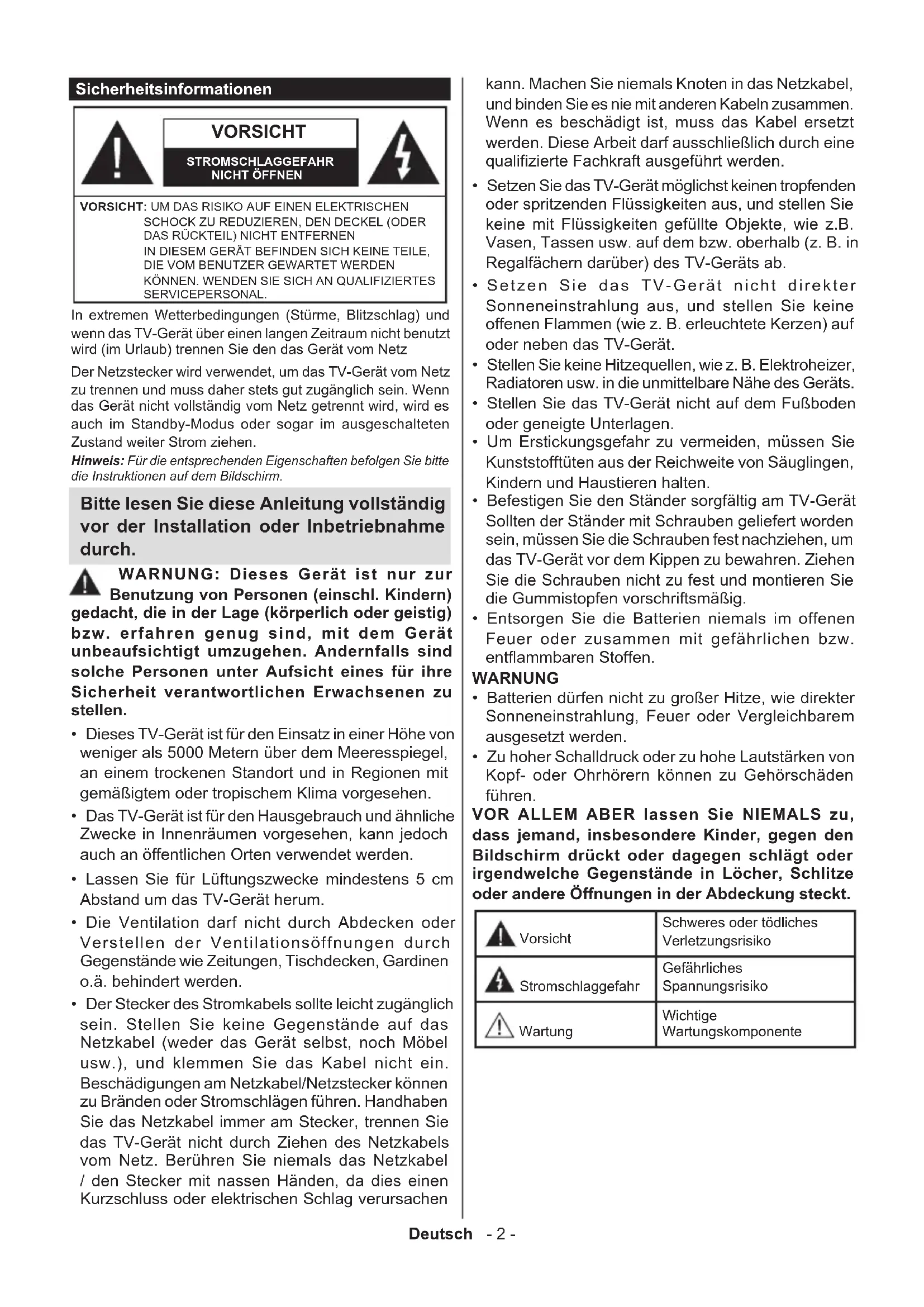 Vorsicht. Bitte beachten Sie die Bedienungsanleitung: Der markierte Bereich bzw. die markierten Bereiche enthalten durch den Benutzer auszutauschende Knopfzellenbatterien. CLASS 1 LASER PRODUCT Gerät der Laserklasse 1: Dieses Gerät enthält eine Laserquelle der Klasse 1, die unter vernünftigerweise vorhersehbaren Betriebsbedingungen ungefährlich ist. WARNUNG Batterien dürfen nicht verschluckt werden, es besteht chemische Verätzungsgefahr. Dieses Gerät bzw. das zum Gerät mitgelieferte Zube- hör enthält möglicherweise eine Knopfzellenbatterie. Wenn die Knopfzellenbatterie verschluckt wird, führt dies innerhalb 2 Stunden zu schweren internen Ver- ätzungen mit möglicher Todesfolge. Halten Sie gebrauchte und neue Batterien von Kin- dern fern. Wenn das Batteriefach nicht sicher geschlossen ist, stoppen Sie die Verwendung des Geräts und halten Sie Kinder fern. Falls Sie den Verdacht haben, dass Batterien ver- schluckt wurden oder in irgendeinen Körperteil platziert wurde, suchen Sie sofort medizinische Hilfe auf. – – – – – – – – – – – – Ein TV-Gerät kann umfallen und dabei ernste Ver- letzungen mit möglicher Todesfolge verursachen. Viele Verletzungen, insbesondere bei Kindern, können vermieden werden, wenn die folgenden einfachen Vorsichtsmaßnahmen getroffen werden: