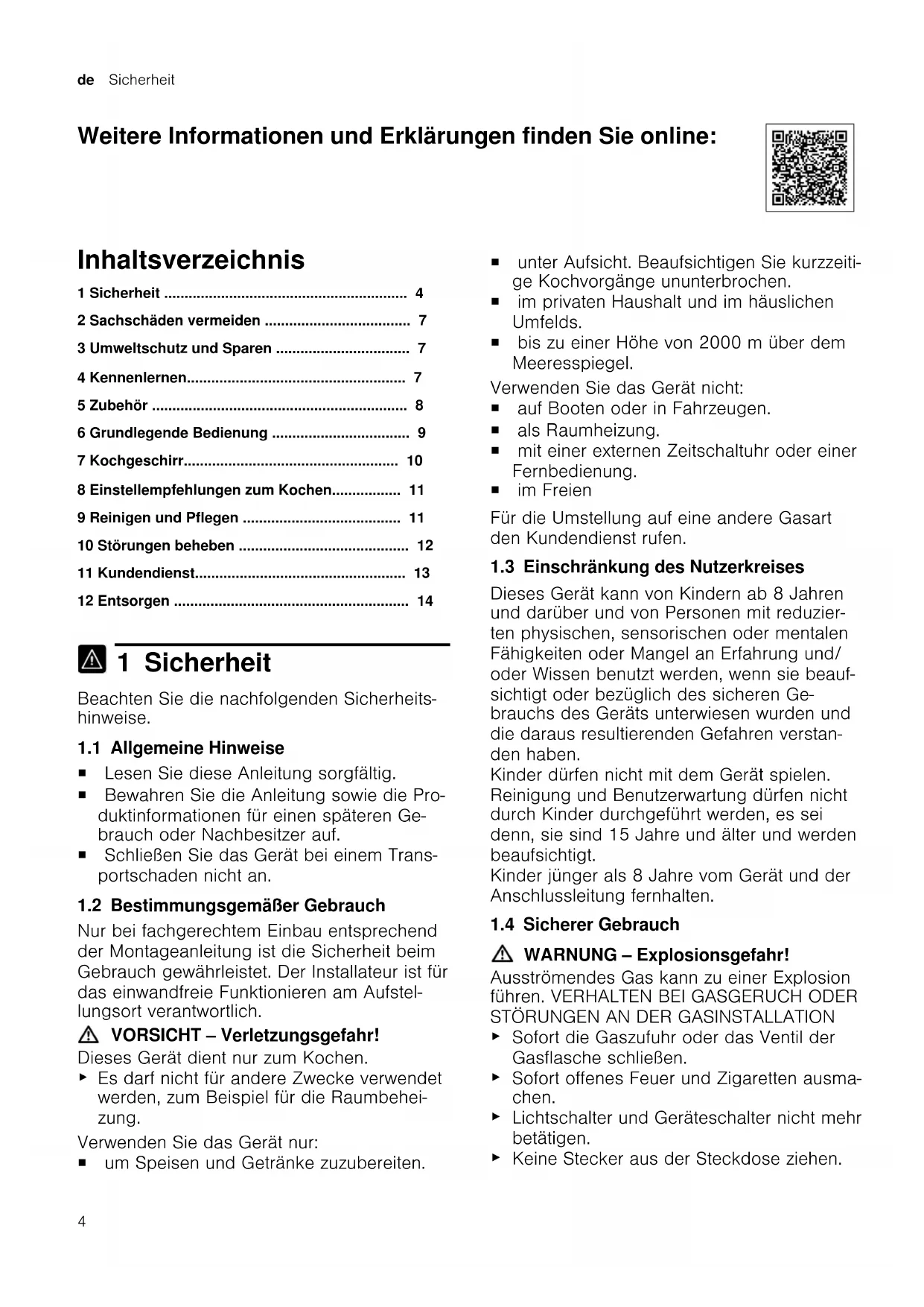 Es darf nicht für andere Zwecke verwendet werden, zum Beispiel für die Raumbehei- zung. Verwenden Sie das Gerät nur: ¡ um Speisen und Getränke zuzubereiten. ¡ unter Aufsicht. Beaufsichtigen Sie kurzzeiti- ge Kochvorgänge ununterbrochen. ¡ im privaten Haushalt und im häuslichen Umfelds. ¡ bis zu einer Höhe von 2000m über dem Meeresspiegel. Verwenden Sie das Gerät nicht: ¡ auf Booten oder in Fahrzeugen. ¡ als Raumheizung. ¡ mit einer externen Zeitschaltuhr oder einer Fernbedienung. ¡ im Freien Für die Umstellung auf eine andere Gasart den Kundendienst rufen. 1.3 Einschränkung des Nutzerkreises Dieses Gerät kann von Kindern ab 8 Jahren und darüber und von Personen mit reduzier- ten physischen, sensorischen oder mentalen Fähigkeiten oder Mangel an Erfahrung und/ oder Wissen benutzt werden, wenn sie beauf- sichtigt oder bezüglich des sicheren Ge- brauchs des Geräts unterwiesen wurden und die daraus resultierenden Gefahren verstan- den haben. Kinder dürfen nicht mit dem Gerät spielen. Reinigung und Benutzerwartung dürfen nicht durch Kinder durchgeführt werden, es sei denn, sie sind 15 Jahre und älter und werden beaufsichtigt. Kinder jünger als 8 Jahre vom Gerät und der Anschlussleitung fernhalten. 1.4 Sicherer Gebrauch WARNUNG‒Explosionsgefahr! Ausströmendes Gas kann zu einer Explosion führen. VERHALTEN BEI GASGERUCH ODER