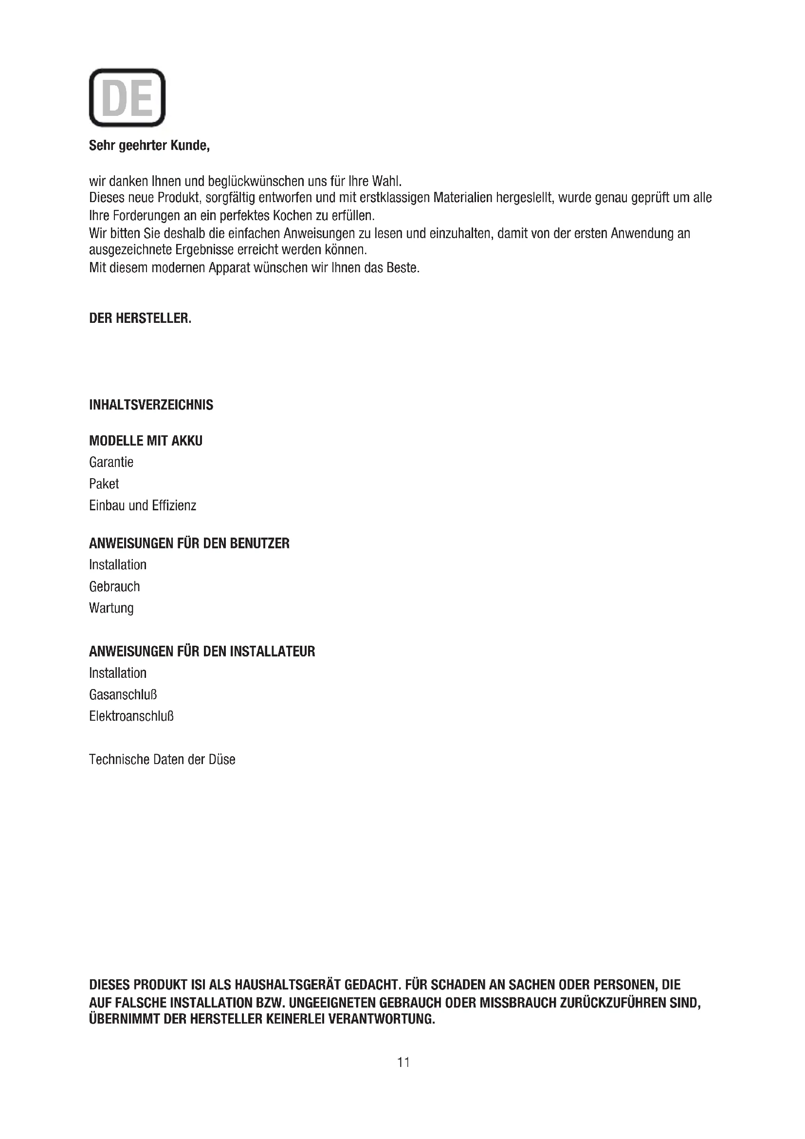 Installation Gasanschluß Elektroanschluß Technische Daten der Düse DIESES PRODUKT ISl ALS HAUSHALTSGERÄT GEDACHT. FÜR SCHADEN AN SACHEN ODER PERSONEN, DIE AUF FALSCHE INSTALLATION BZW. UNGEEIGNETEN GEBRAUCH ODER MISSBRAUCH ZURÜCKZUFÜHREN SIND, ÜBERNIMMT DER HERSTELLER KEINERLEI VERANTWORTUNG. DE12