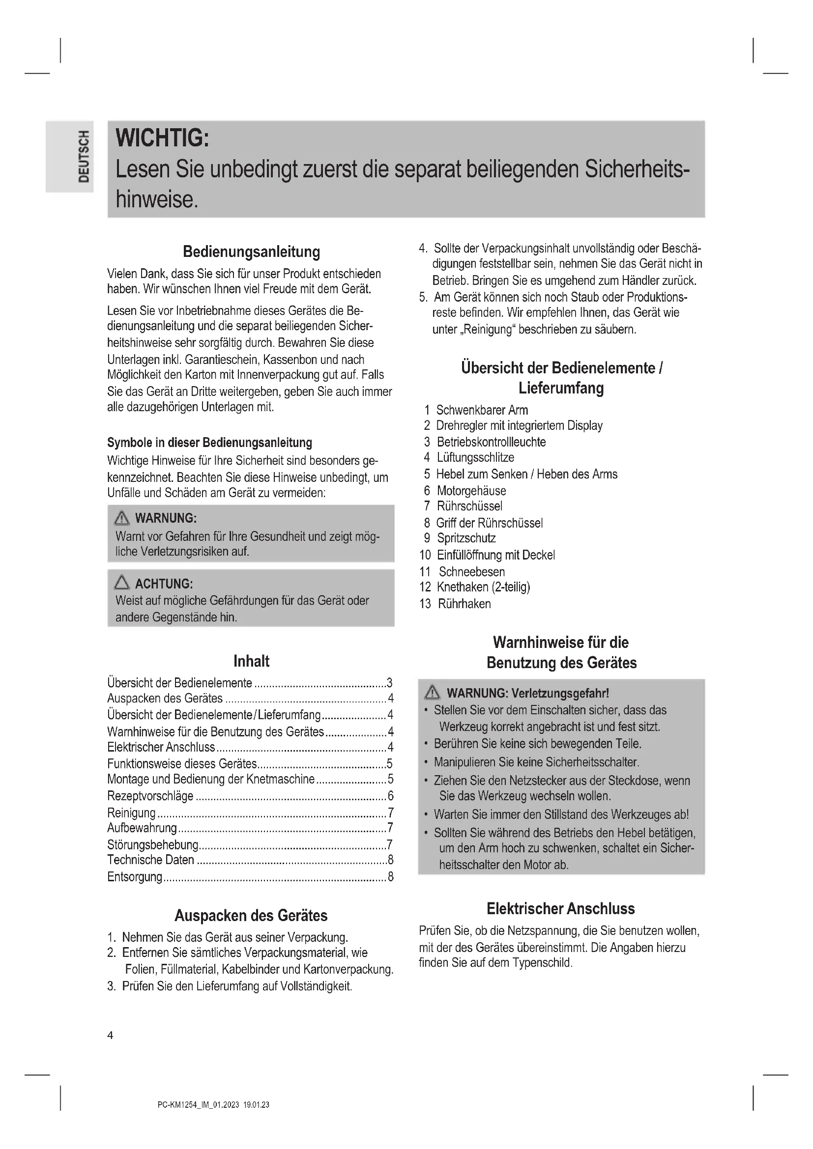 - Sollten Sie während des Betriebs den Hebel betätigen, um den Arm hoch zu schwenken, schaltet ein Sicher- heitsschalter den Motor ab. Elektrischer Anschluss Prüfen Sie, ob die Netzspannung, die Sie benutzen wollen, mit der des Gerätes übereinstimmt. Die Angaben hierzu nden Sie auf dem Typenschild.5 PC-KM1254_IM_01.2023 19.01.23 Funktionsweise dieses Gerätes Schutzfunktionen