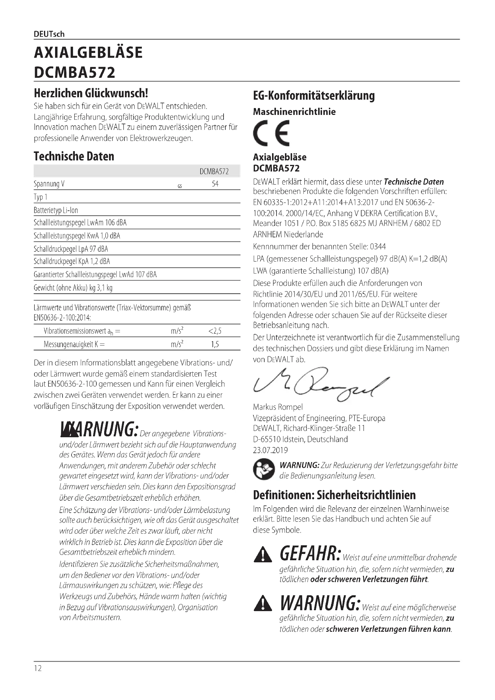 m/s² <2,5Messungenauigkeit K =m/s² 1,5Deutsch (Übersetzung der Originalanweisung) Herzlichen Glückwunsch! Sie haben sich für ein Gerät von DeWALT entschieden. Langjährige Erfahrung, sorgfältige Produktentwicklung und Innovation machen DeWALT zu einem zuverlässigen Partner für professionelle Anwender vonElektrowerkzeugen. Technische Daten AXIALGEBLÄSE DCMBA572 EG-Konformitätserklärung Maschinenrichtlinie Axialgebläse DCMBA572 DeWALT erklärt hiermit, dass diese unter Technische Daten beschriebenen Produkte die folgenden Vorschriften erfüllen: EN 60335-1:2012+A11:2014+A13:2017 und EN 50636-2-100:2014. 2000/14/EC, Anhang V DEKRA Certification B.V., Meander 1051 / P.O. Box 5185 6825 MJ ARNHEM / 6802 ED ARNHEM NiederlandeKennnummer der benannten Stelle: 0344 LPA (gemessener Schallleistungspegel) 97 dB(A) K=1,2 dB(A)LWA (garantierte Schallleistung) 107 dB(A)Diese Produkte erfüllen auch die Anforderungen von Richtlinie 2014/30/EU und 2011/65/EU. Für weitere Informationen wenden Sie sich bitte an DeWALT unter der folgenden Adresse oder schauen Sie auf der Rückseite dieser Betriebsanleitungnach.Der Unterzeichnete ist verantwortlich für die Zusammenstellung des technischen Dossiers und gibt diese Erklärung im Namen von DeWALTab.Markus Rompel Vizepräsident of Engineering, PTE-Europa DeWALT, Richard-Klinger-Straße 11 D-65510 Idstein, Deutschland 23.07.2019WARNUNG: Zur Reduzierung der Verletzungsgefahr bitte die Bedienungsanleitunglesen. Definitionen: Sicherheitsrichtlinien Im Folgenden wird die Relevanz der einzelnen Warnhinweise erklärt. Bitte lesen Sie das Handbuch und achten Sie auf dieseSymbole.