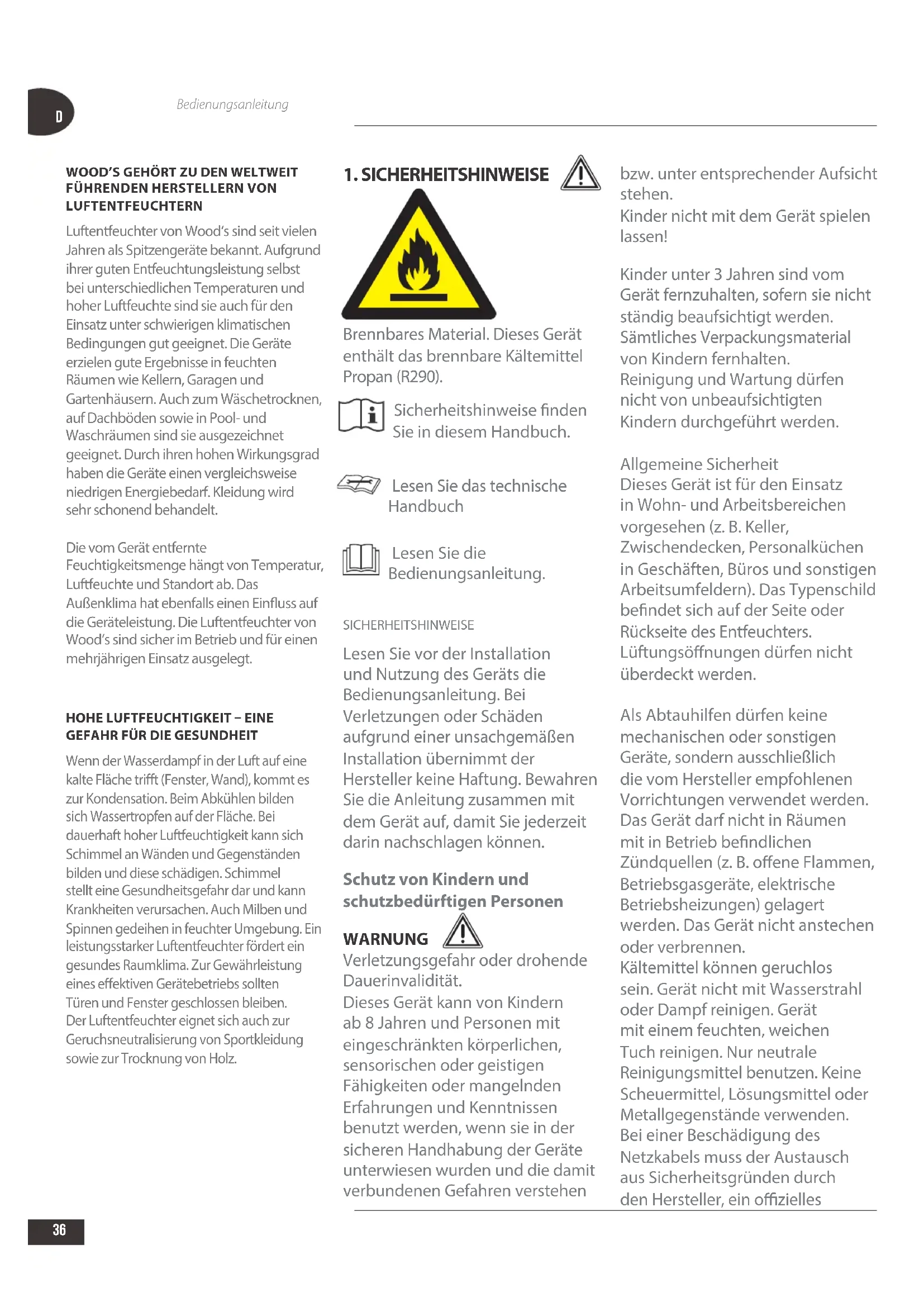 TECHNISCHE DATEN MRD20GW Max. Betriebsbereich 70 m Umluftleistung 175m /h±10%Entfeuchtung bei 30°C und 80 % RF20 Liter pro 24 StundenLeistung bei 30°C und 80% RF 280 W±10%Fassungsvermögen Wassertank 3,8 LiterKältemittel R290Ladung R290 60 g Spannung 220–240 VGeräuschpegel in Dezibel 48 dBGewicht 15,5 kgAbmessungen in mm, L x B x H 355x252x567 *Technische Änderungen und Verbesserungen vorbehalten. Alle Angaben sind Richtwerte und können aufgrund von äußeren Einüssen wie Temperatur, Belüftung und Luftfeuchtigkeit variieren. *Mit dieser Kennzeichnung darf das Gerät EU-weit nicht mit dem normalen Haushaltsabfall entsorgt werden. Um mögliche Schäden für die Umwelt oder die menschliche Gesundheit durch unkontrollierte Abfallentsorgung zu verhindern, ist ein verantwortungsvolles Recycling sicherzustellen und somit die nachhaltige Wiederverwendung materieller Ressourcen zu fördern. Für die Rückgabe des Geräts an uns stehen Rücksendungs- und Sammelsysteme zur Verfügung. Alternativ ist Kontakt zu dem Händler aufzunehmen, bei dem das Produkt gekauft wurde. Die Händler können dieses Produkt einem umweltschonenden Recycling zuführen. HINWEIS! Registrieren Sie sich bei www.warranty-woods. com. Dort erfahren Sie, wie Sie eine erweiterte Garantie erhalten. Weitere Informationen nden Sie auf www.woods.se/de. Empfohlene Betriebsgrenzwerte Temp. +5 ˚C bis +35 ˚C Relative Luftfeuchtigkeit: 30 bis 90 % Empf. Luftfeuchte: ca. 50 % RH Garantien 2 Jahre Verbrauchergarantie auf Produktionsfehler. Es ist zu beach- ten, dass die Garantie nur bei Vorlage der Quittung gilt. Die Garantie gilt nur, wenn das Produkt in Übereinstimmung mit den Anweisungen und Sicherheitshinweisen in diesem Handbuch verwendet wird. Die Garantie deckt keine Schäden ab, die durch unsachgemäße Hand- habung des Produkts verursacht werden. HINWEIS: Die zweijährige Garantie gilt nur für Endverbraucher und nicht bei gewerblicher Nutzung des Geräts. MRD25GW Max. Betriebsbereich 120 m Umluftleistung 180m3 h±10% Entfeuchtung bei 30°C und 80 % RF25 Liter pro 24 StundenLeistung bei 30°C und 80% RF 280 W±10%Fassungsvermögen Wassertank 3,8 LiterKältemittel R290Ladung R290 85 gSpannung 220–240 VGeräuschpegel in Dezibel 48 dBGewicht 16 kgAbmessungen in mm, L x B x H 355x252x567F Guide d’instructions